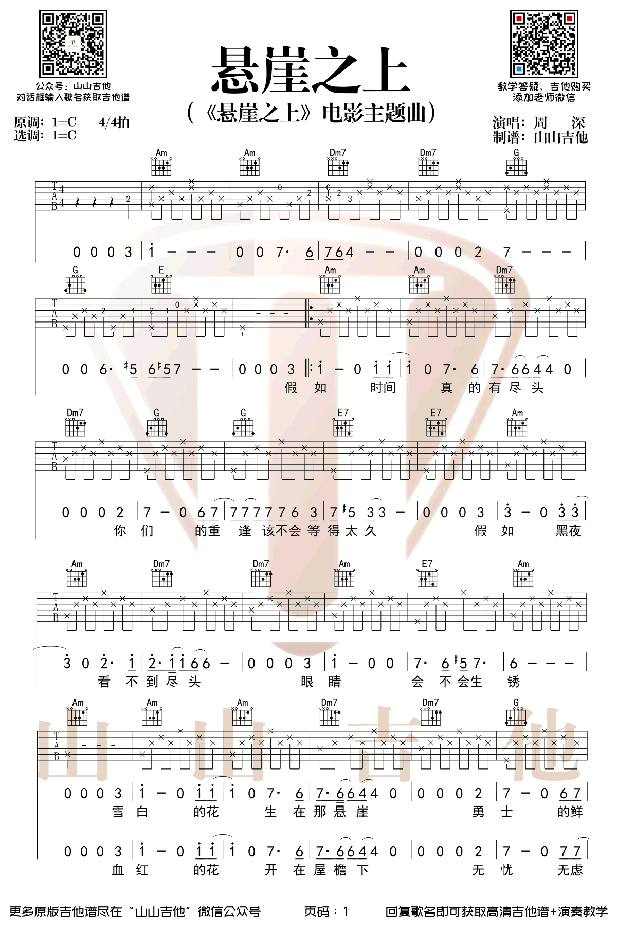 悬崖之上吉他谱,周深演唱,张艺谋导演的谍战电影同名主题曲,悬崖之上吉他六线谱,C调弹唱,两张弹唱图片谱。易唱网上传,山山吉他制谱出品。整首歌用到的和弦不多,而且大部分是一个和弦弹奏两个小节,节奏部分非常简单,几乎都是八分音符。整首歌难度很低,新手小白用来练习和弦转换非常合适,进阶的同学可以做一些个人处理,加入技巧。好啦,同学们加油吧!