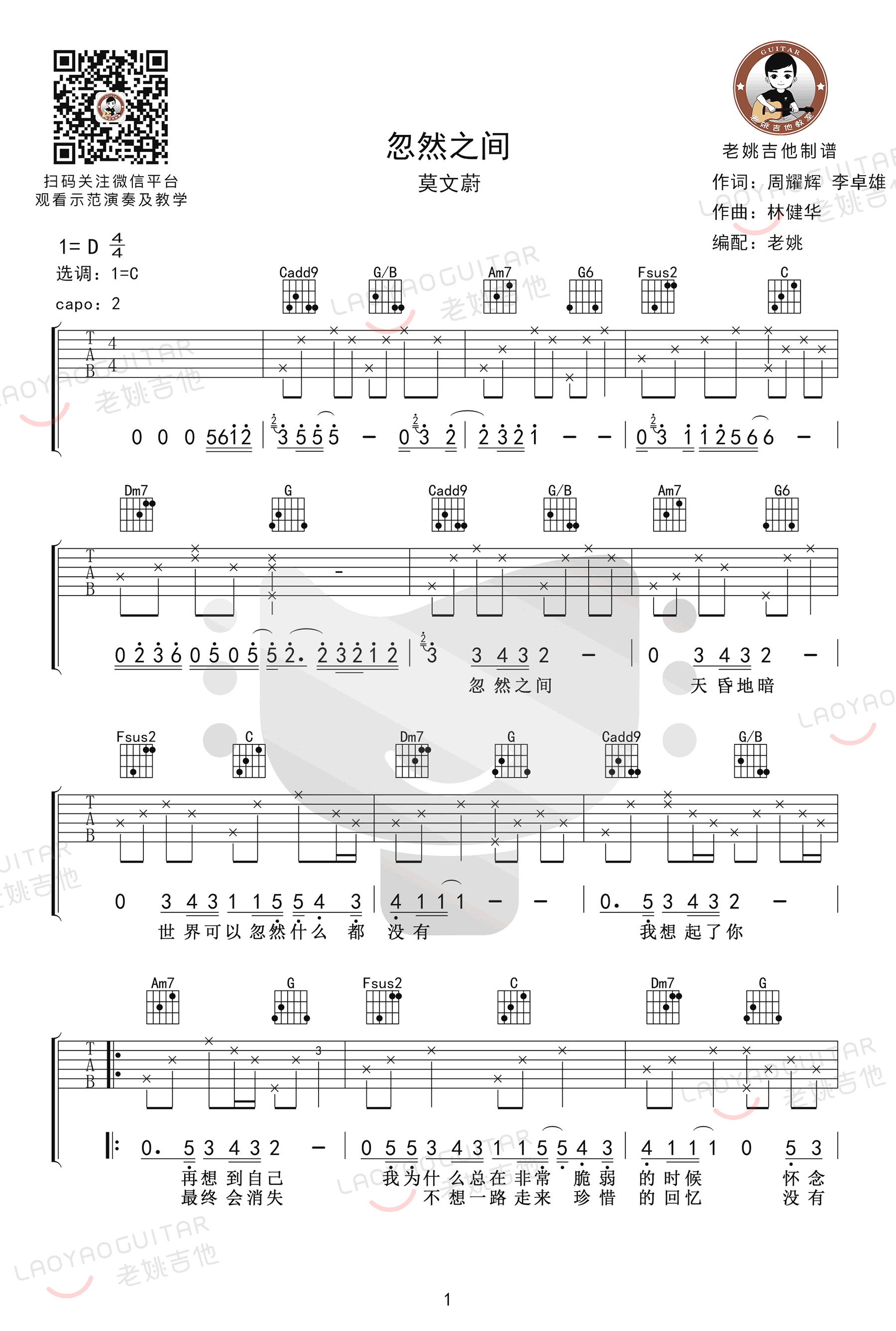 - 忽然之间吉他谱_莫文蔚_C调原版六线谱_弹唱教学视频