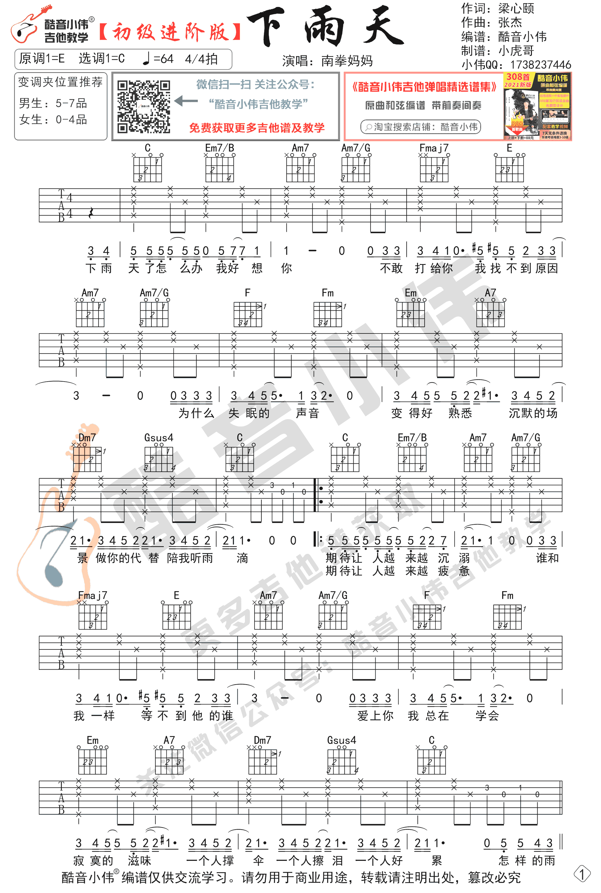 - 下雨天吉他谱_南拳妈妈_C调初级进阶版_弹唱演示+教学讲解