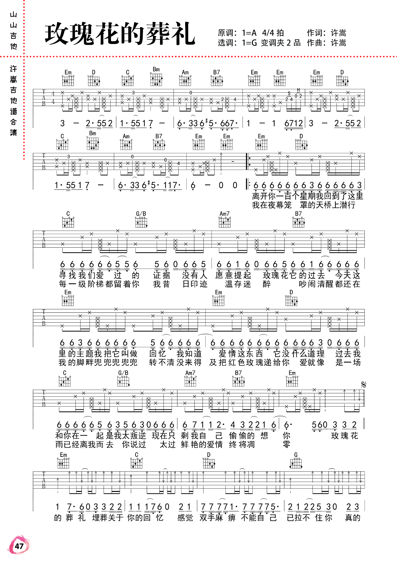 - 玫瑰花的葬礼吉他谱_许嵩_G调指法_弹唱六线谱