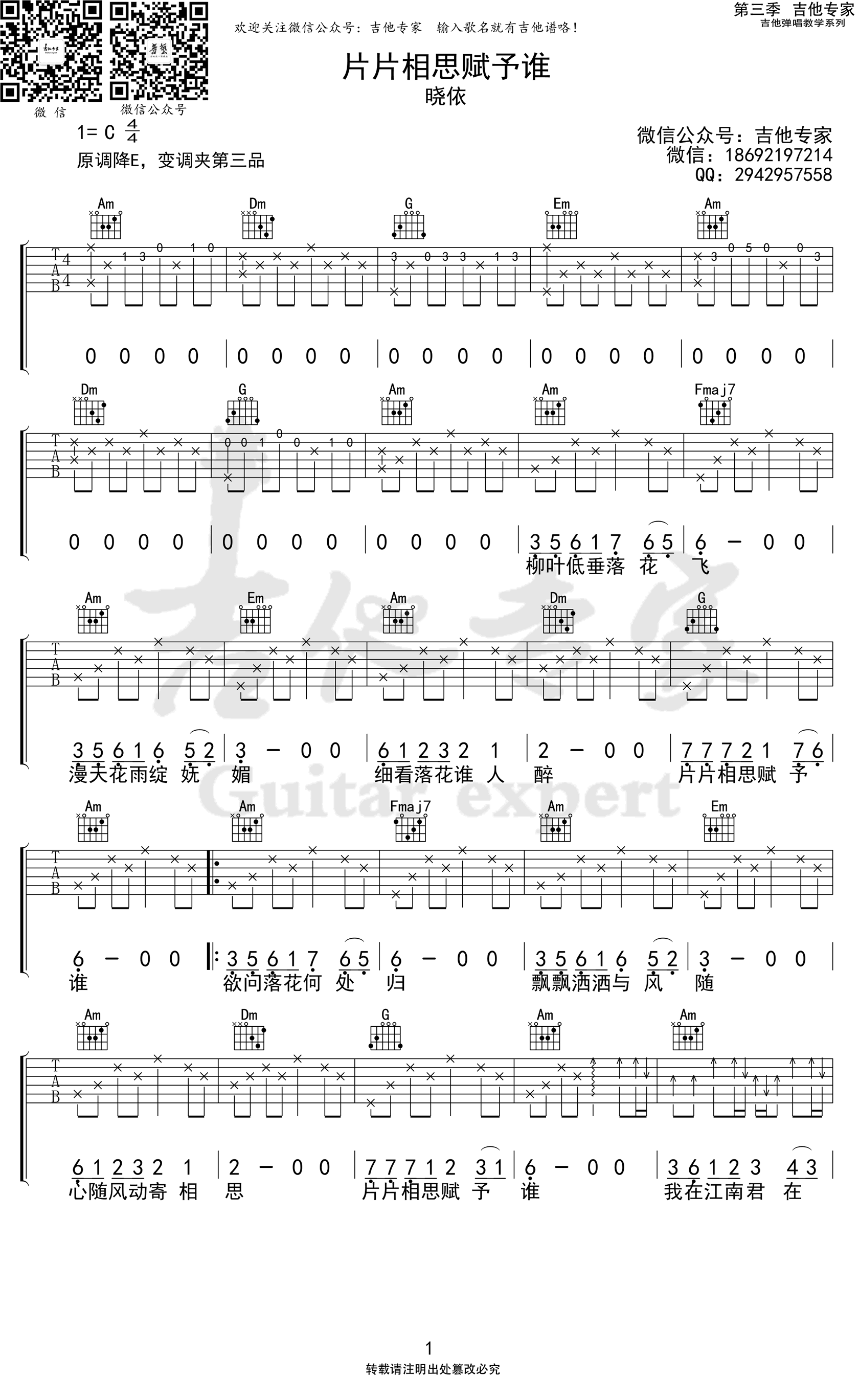 - 片片相思赋予谁吉他谱_晓依_C调弹唱谱_高清图片谱