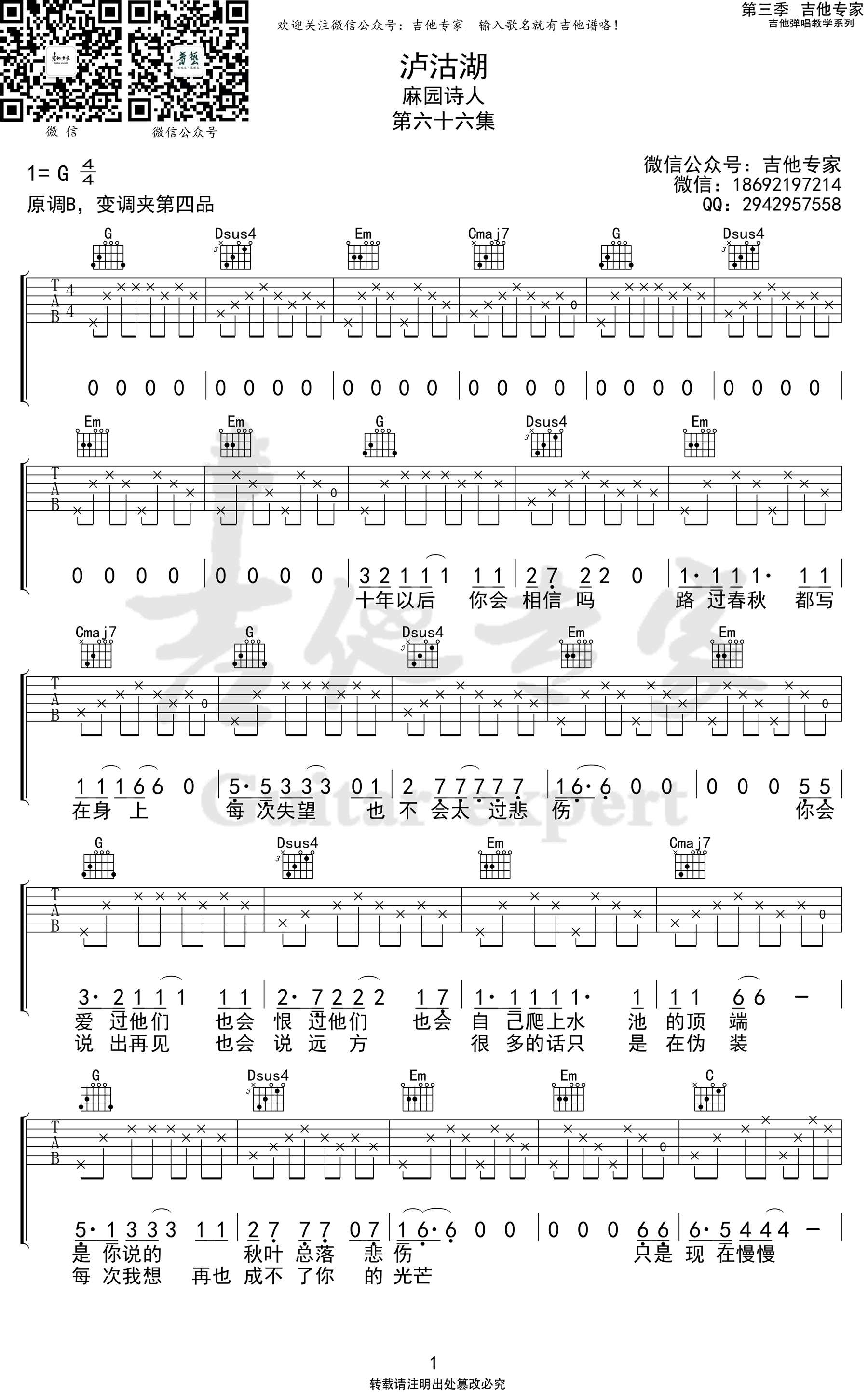- 泸沽湖吉他谱_麻园诗人_G调指法_高清弹唱谱