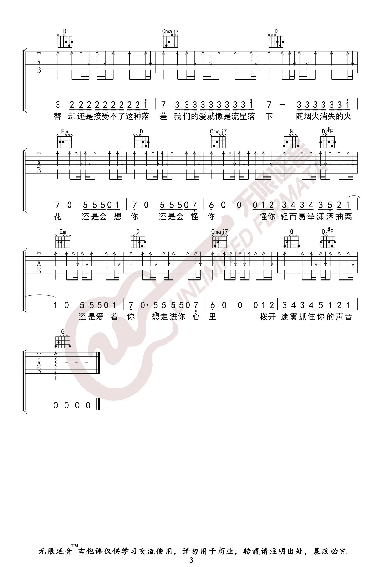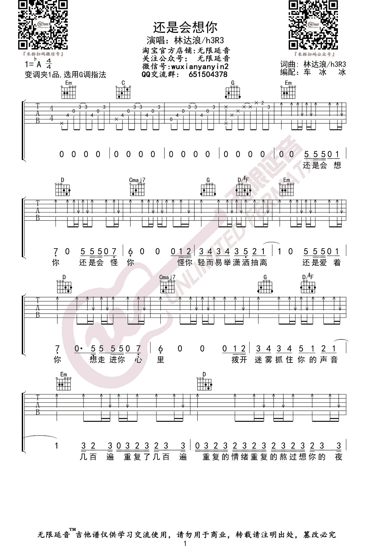 - 还是会想你吉他谱_林达浪/H3R3_G调原版_高清六线谱