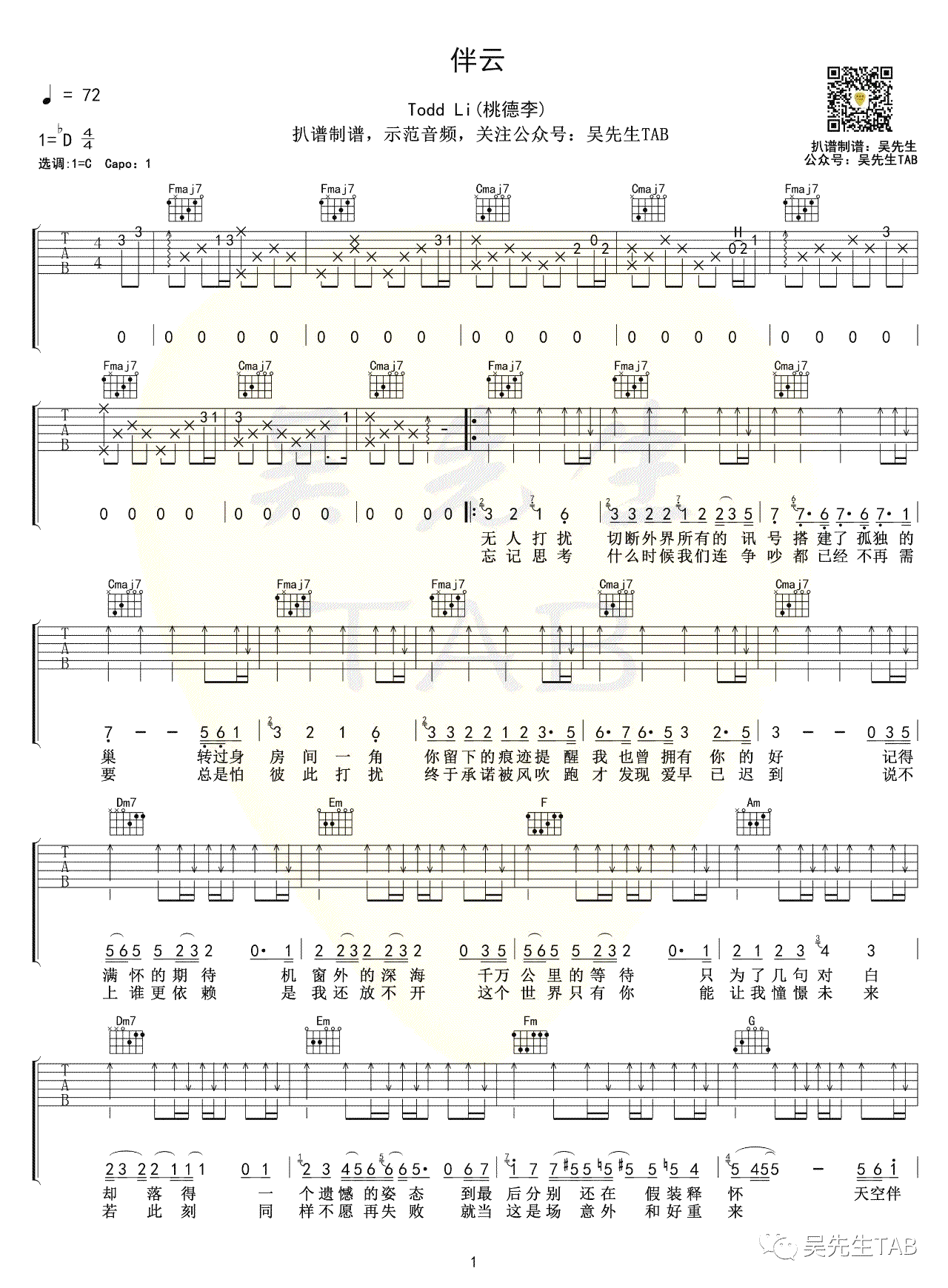 - 伴云吉他谱_Todd Li(桃德李)_C调弹唱谱