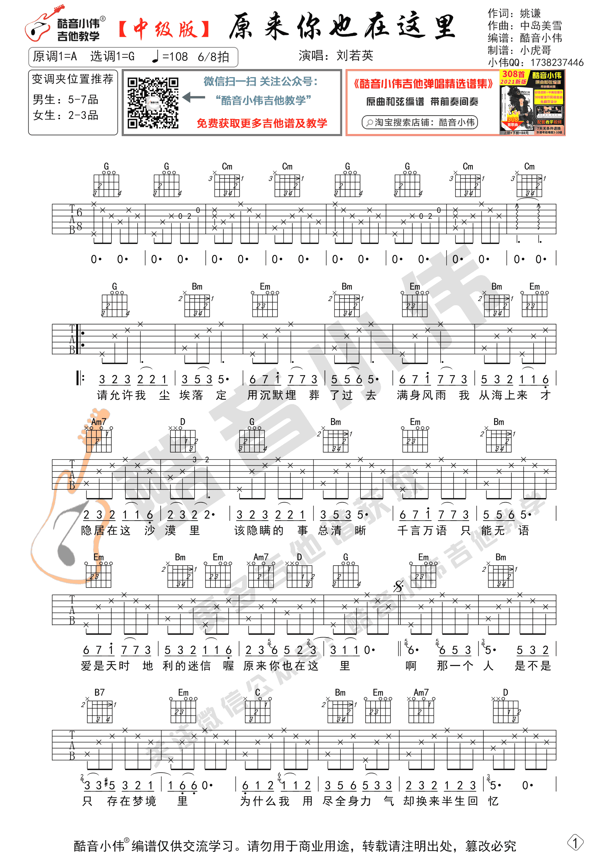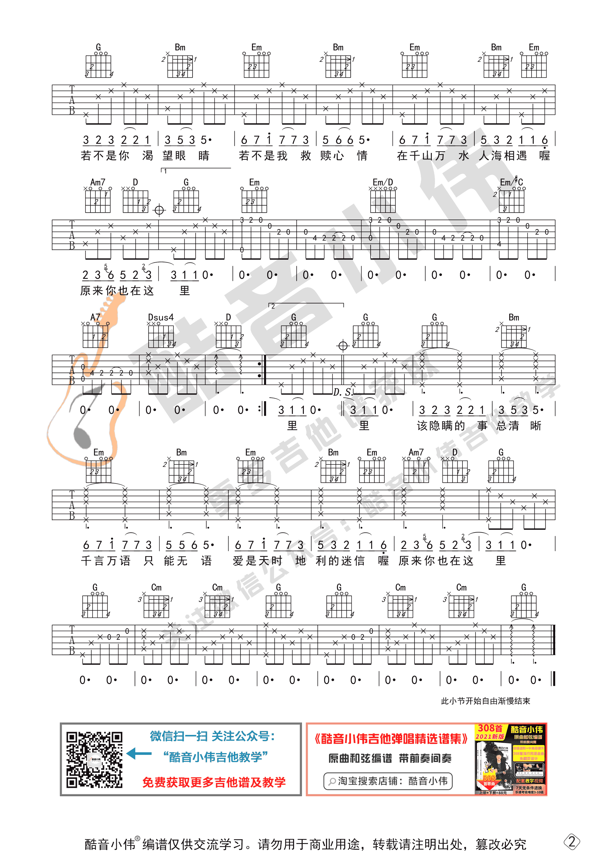 在千山万水人海中相遇,原来你也在这里,曲谱适合初学进阶练习,附上歌曲吉他弹唱教学,琴友们可以跟着老师的视频讲解分小节逐步学习。