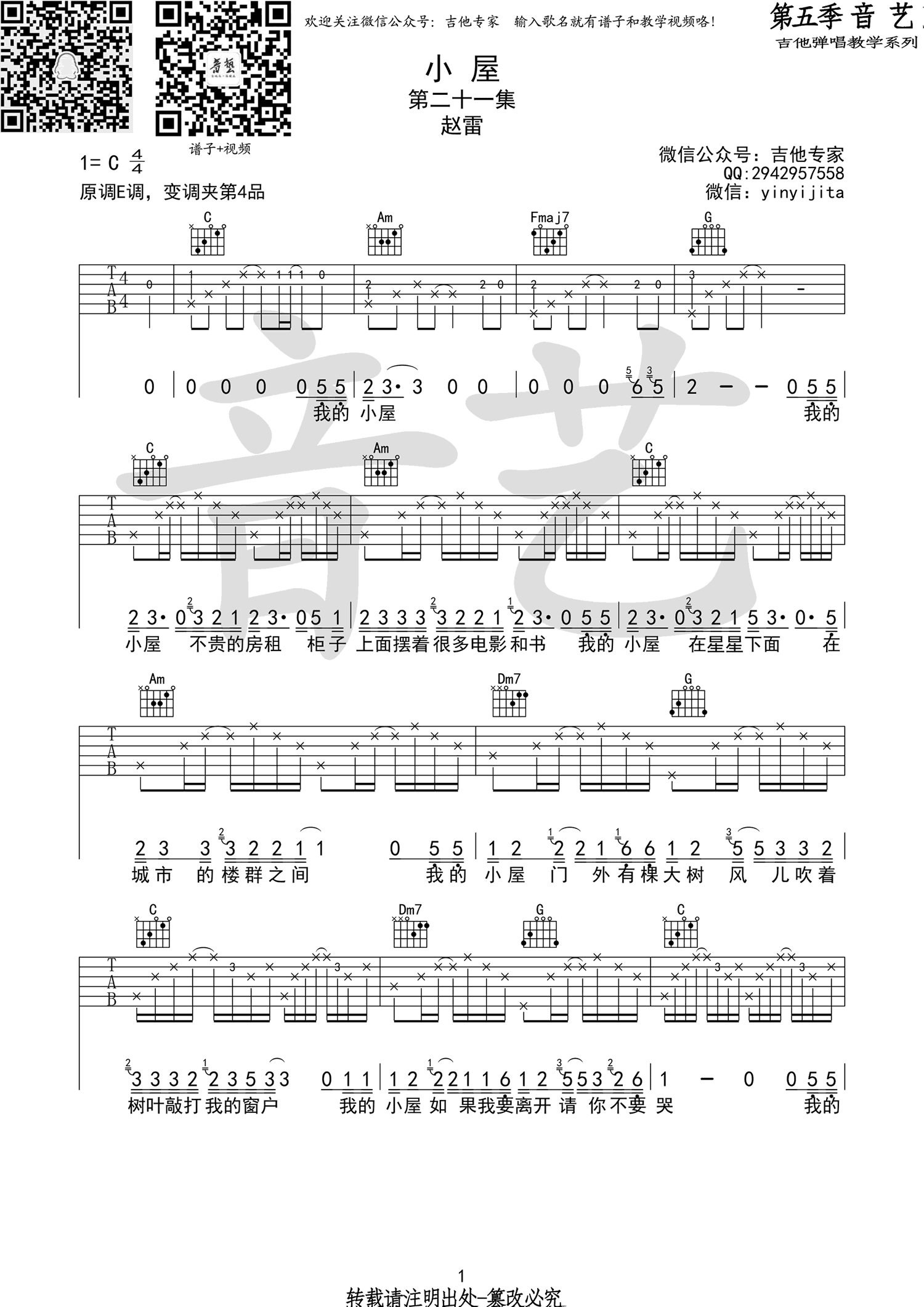 小屋 - 赵雷 词:赵雷 曲:赵雷 嘿 我的小屋 我的小屋 不贵的房租 柜子上面摆着很多电影和书 我的小屋 在星星下面 在城市的楼群之间 我的小屋 门外有棵大树 风儿吹着树叶敲打我的窗户 我的小屋 如果我要离开 请你不要哭 我的小屋 我喜欢给你唱歌 我喜欢坐在门外看日落日出 我的小屋 我可以光着屁股 让你看到我的肌肉和肋骨 我的小屋 不用和他们一样 累的时候我不用去故作笑容 我的小屋 黑夜里的眼睛 望着我的全部 我的小屋 已经上了岁数 门上的油漆已经看不清楚 小屋你可感到 我来去的脚步 在你心脏里我丢不去孤独 只有你小屋 我觉得舒服 只有你小屋 装满了宽恕 我的小屋 我喜欢给你唱歌 我喜欢坐在门外看日落日出 我的小屋 我可以光着屁股 让你看到我的肌肉和肋骨 我的小屋 不用和他们一样 累的时候我不用去故作笑容 我的小屋 黑夜里的眼睛 望着我的全部 我的小屋 已经上了岁数 门上的油漆已经看不清楚 小屋你可感到 我来去的脚步 在你心脏里我丢不去孤独 只有你小屋 我觉得舒服 只有你小屋 里面装满了宽恕 我的小屋 已经上了岁数 门上的油漆已经看不清楚 小屋你可感到 我来去的脚步 在你心脏里我丢不去孤独 只有你小屋 我觉得舒服 只有你小屋 里面装满了宽恕