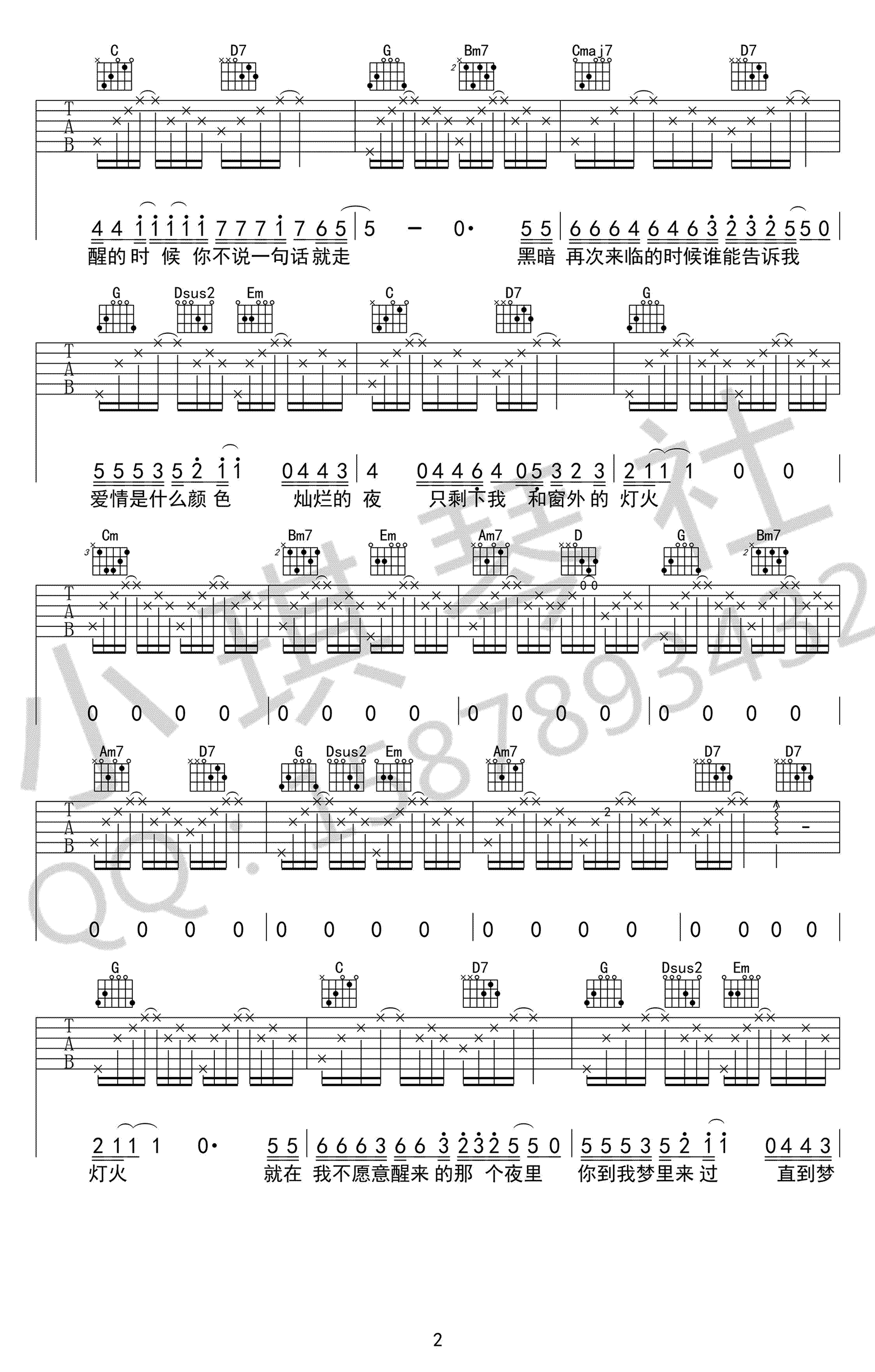 - 从夜晚到清晨吉他谱 贰佰 G调指法 高清六线谱