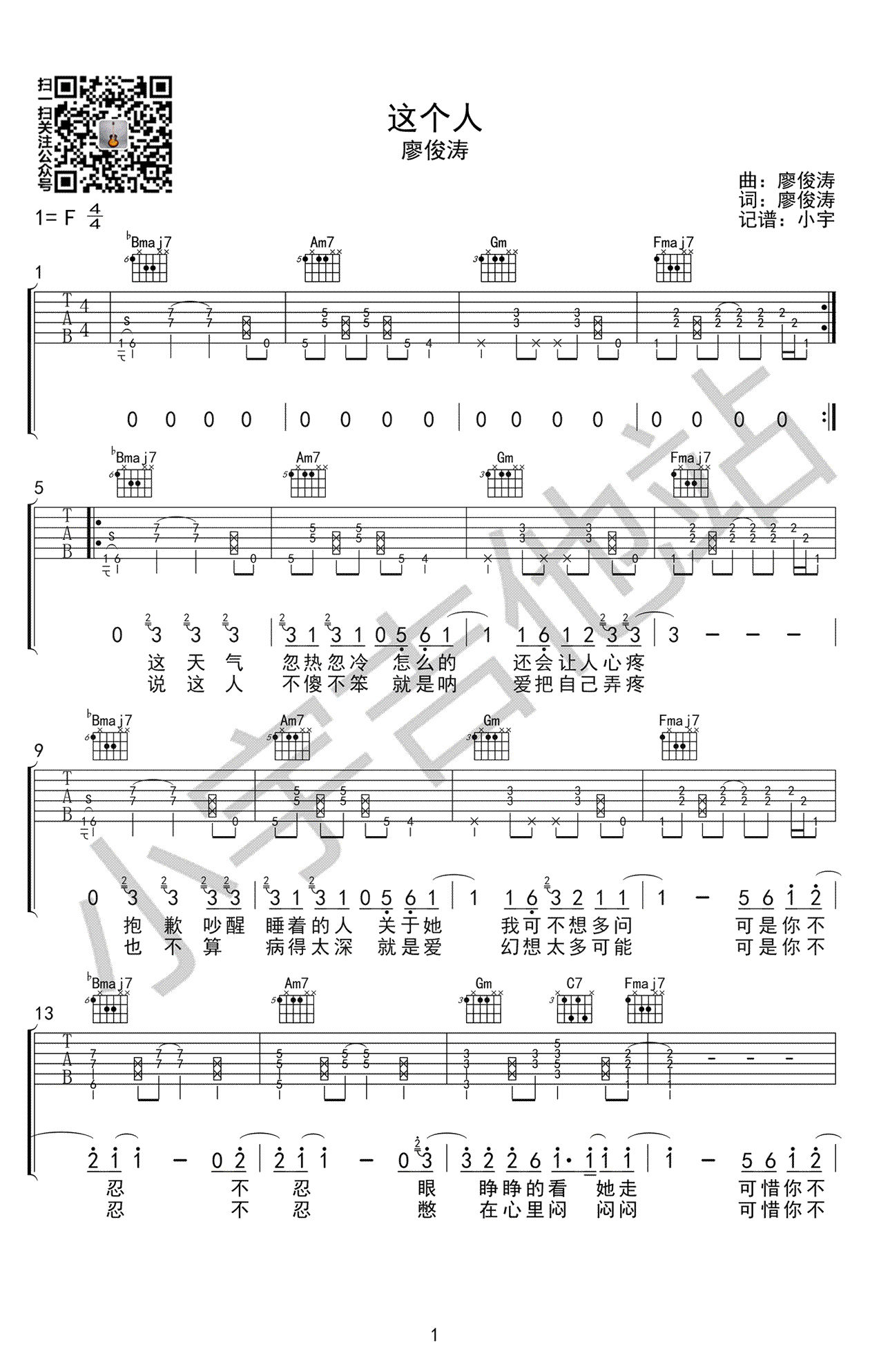 这个人 歌词 作曲 : 廖俊涛 作词 : 廖俊涛 编曲 : 廖俊涛 这天气忽热忽冷 怎么的 还会让人心疼 抱歉吵醒睡着的人 关于她我可不想多问 可是你不忍 不忍眼睁睁的看她走 可惜你不能 不能接受她爱自由的天分 难道要奋不顾身满是伤痕 死去活来没有分寸 怪只怪爱的不深 却躲不过感情的残忍 说这人不傻不笨 就是呐爱把自己弄疼 也不算病得太深 就是爱幻想太多可能 可是你不忍 不忍憋在心里闷闷闷 可惜你不能 不能改变她冷冰冰的体温 难道要奋不顾身满是伤痕 死去活来没有分寸 怪只怪爱的不深 却躲不过感情的残忍 这个人 站不稳 有疑难杂症 能不能 能不能帮忙叫一下医生 有个人奋不顾身满是伤痕 死去活来没有分寸 怪只怪爱的不深 却躲不过感情的残忍 这个人需要医生满是伤痕死去活来没有分寸 怪只怪爱的不深 却躲不过感情的残忍 制作人:谭伊哲 混音:杜一超 音乐总监:谭伊哲 乐队总监:黄竣琮 乐队:TYZ乐队 贝斯:王瀚一 键盘:王迦奕 鼓手:龙江浩 吉他&电脑工程:黄竣琮 音乐制作发行:哇唧唧哇×智慧大狗