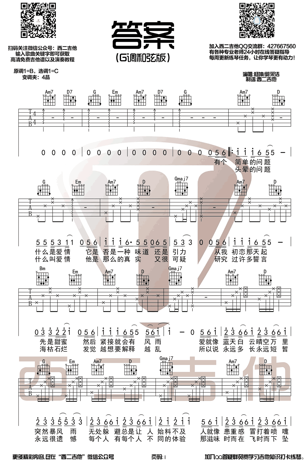 - 答案吉他谱 杨坤VS郭采洁 抖音歌曲吉他谱 果木音乐版