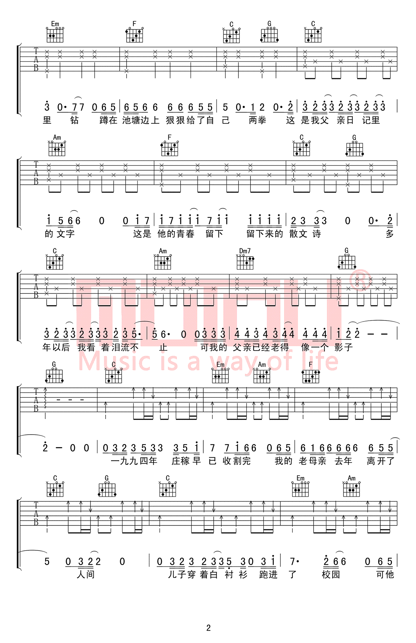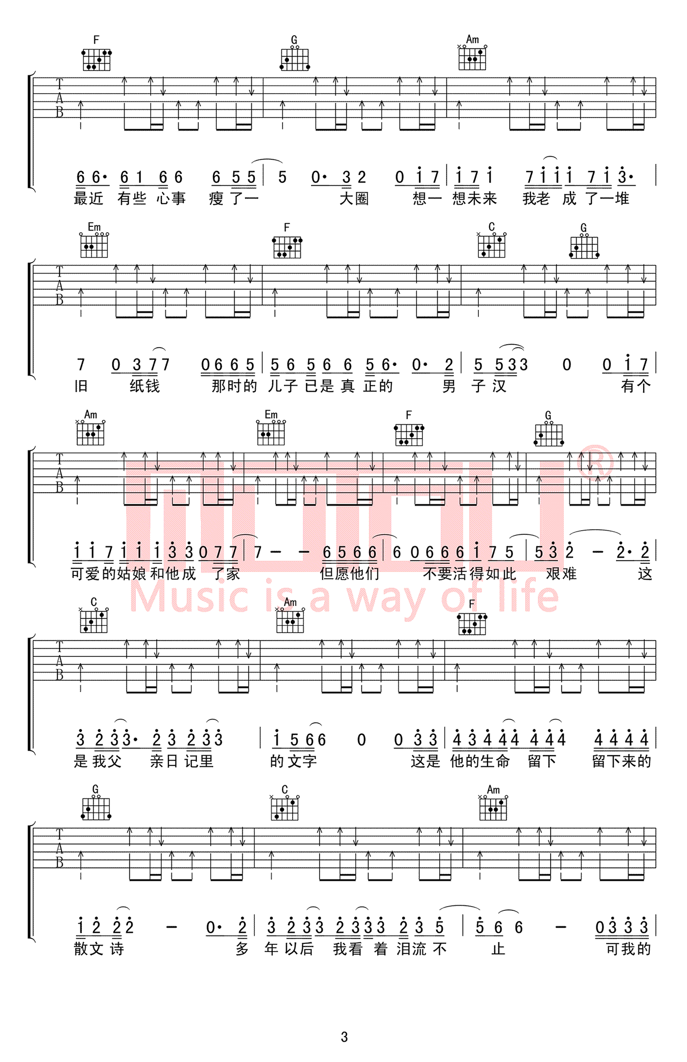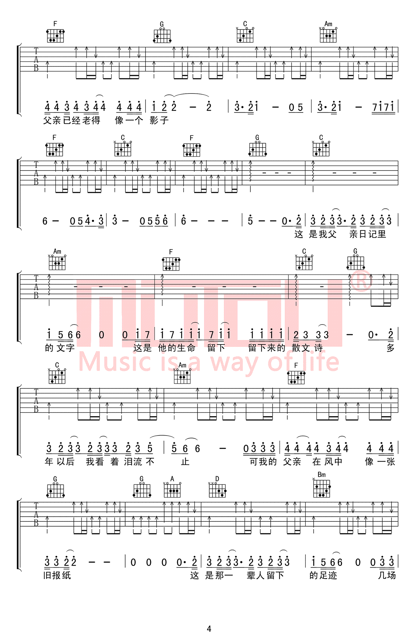 - 父亲写的散文诗吉他谱 C调六线谱 李健 高清弹唱谱