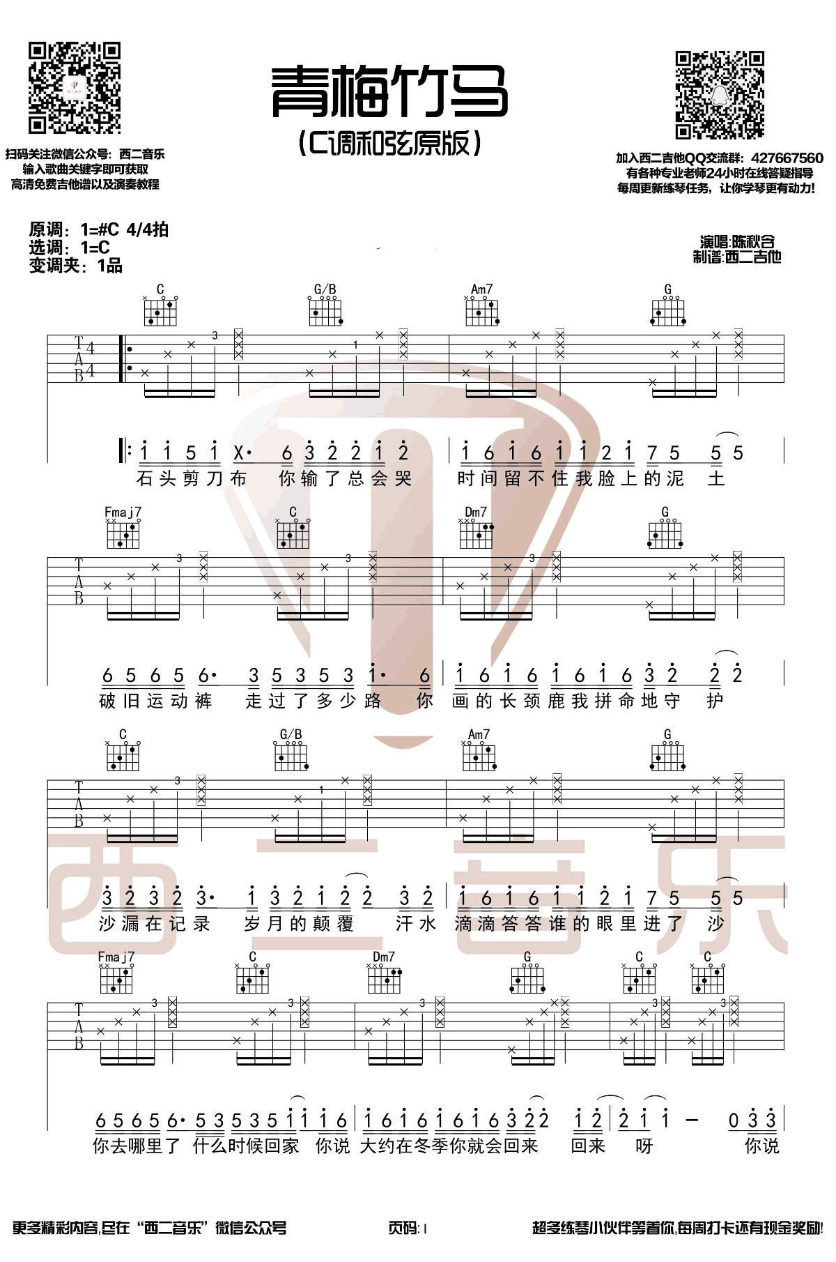 - 青梅竹马吉他谱 陈秋含 C调弹唱谱 吉他示范视频