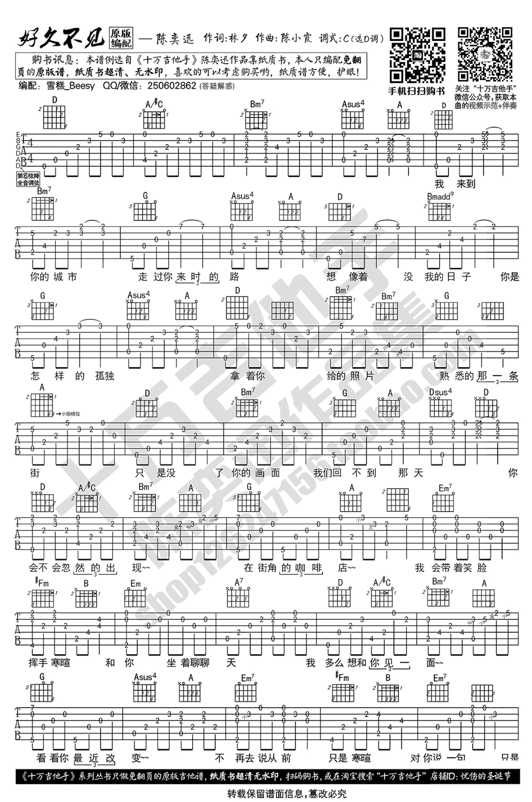- 陈奕迅《好久不见》吉他谱 C调简单版 高清弹唱谱
