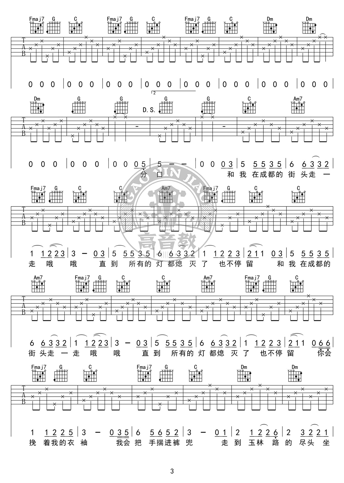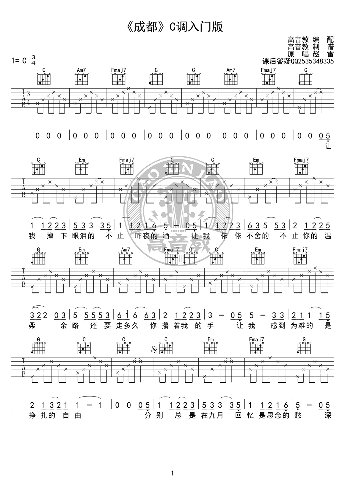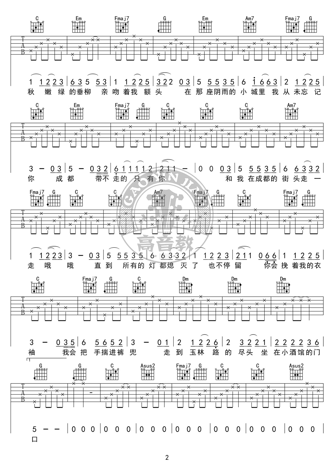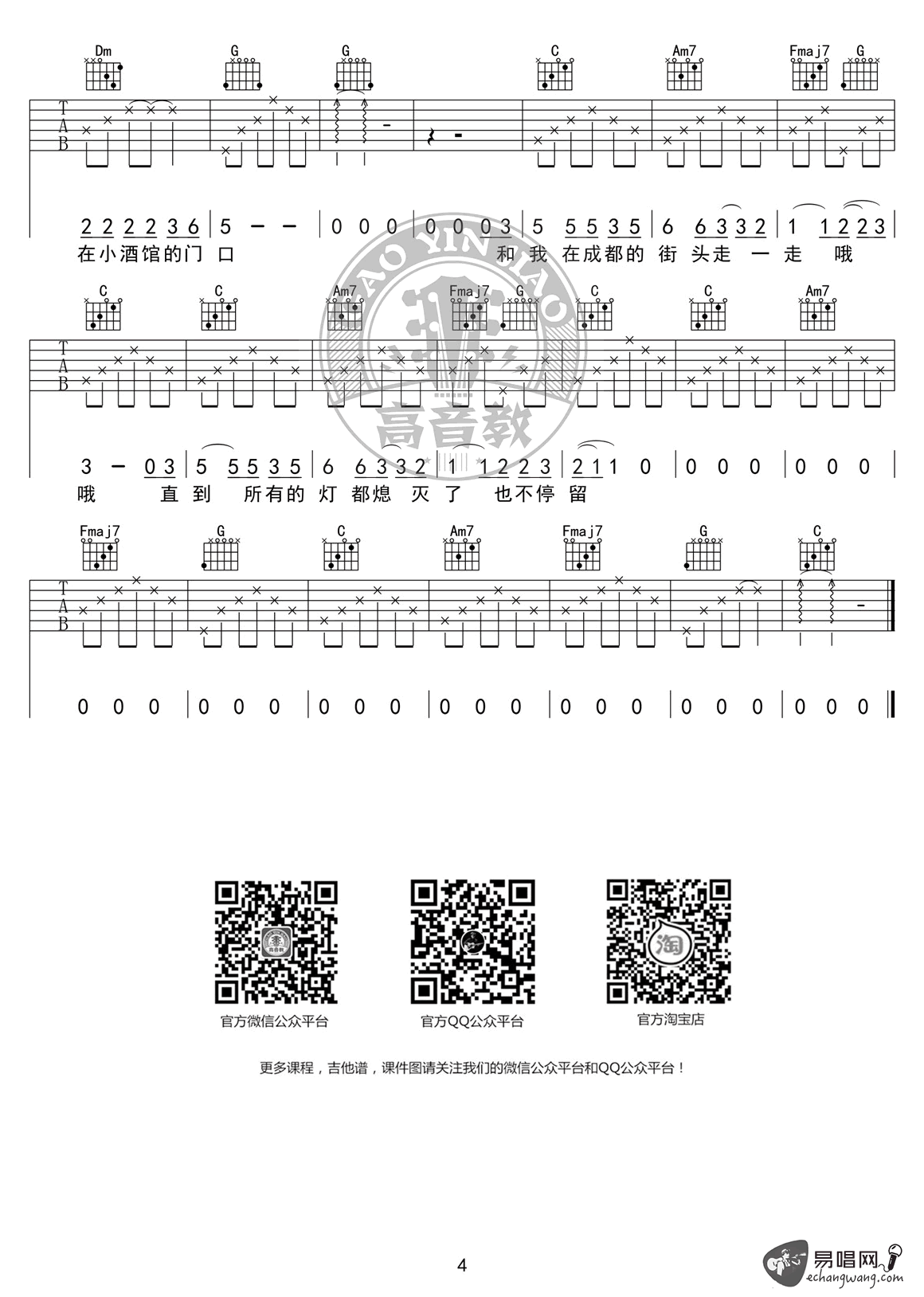 成都吉他谱,赵雷演唱代表作品,一首城市情歌民谣歌曲,《成都》六线谱,四张高清图片弹唱谱。歌曲选用C调指法,感谢高音教的编配和提供的弹唱教学视频讲解,易唱网推荐分享。