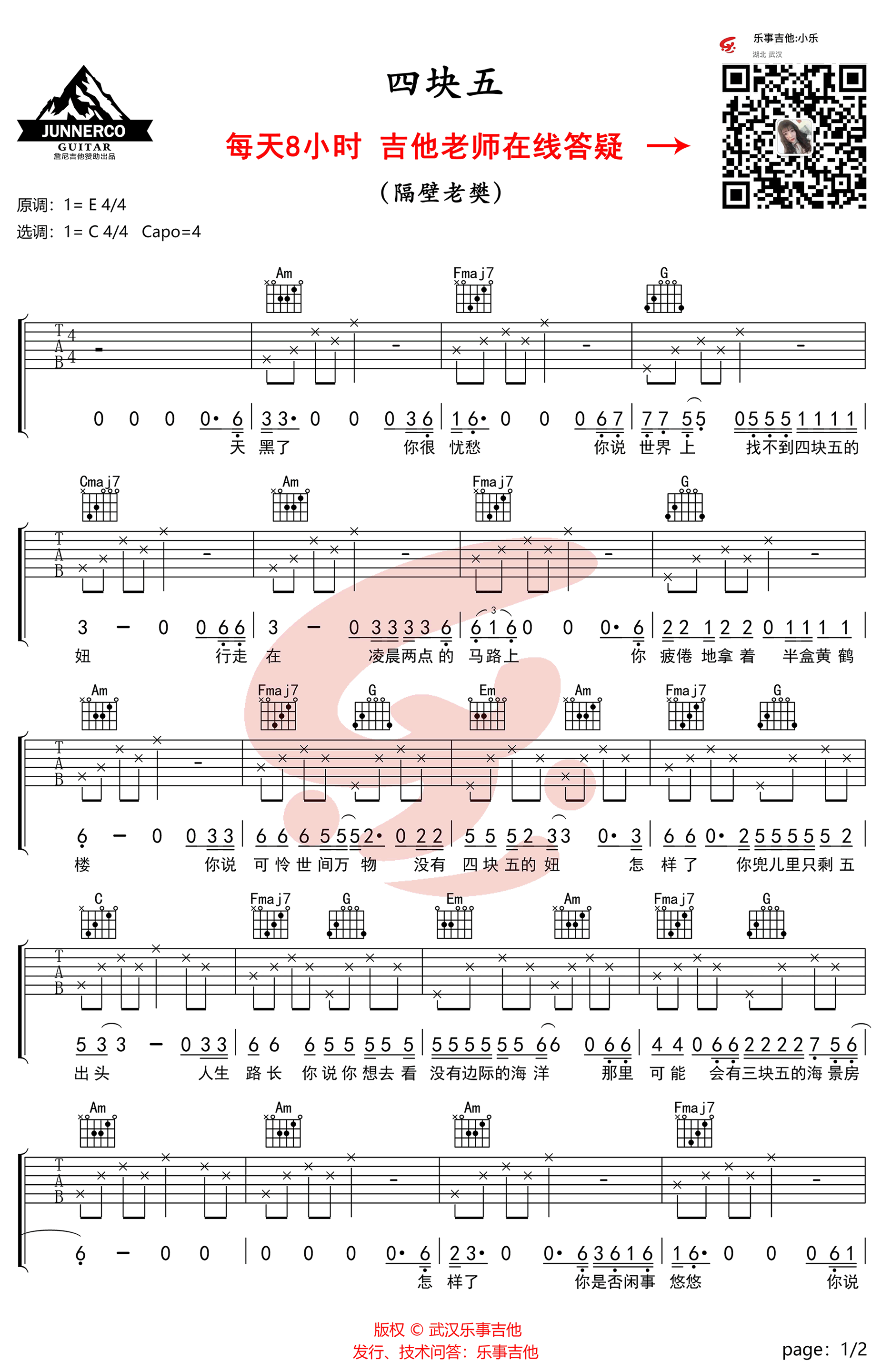 - 四块五吉他谱_隔壁老樊_C调简单版_吉他教学视频