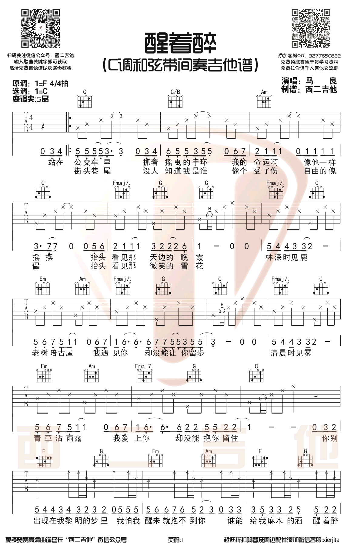 - 马良《醒着醉》吉他谱_C调高清版_弹唱六线谱