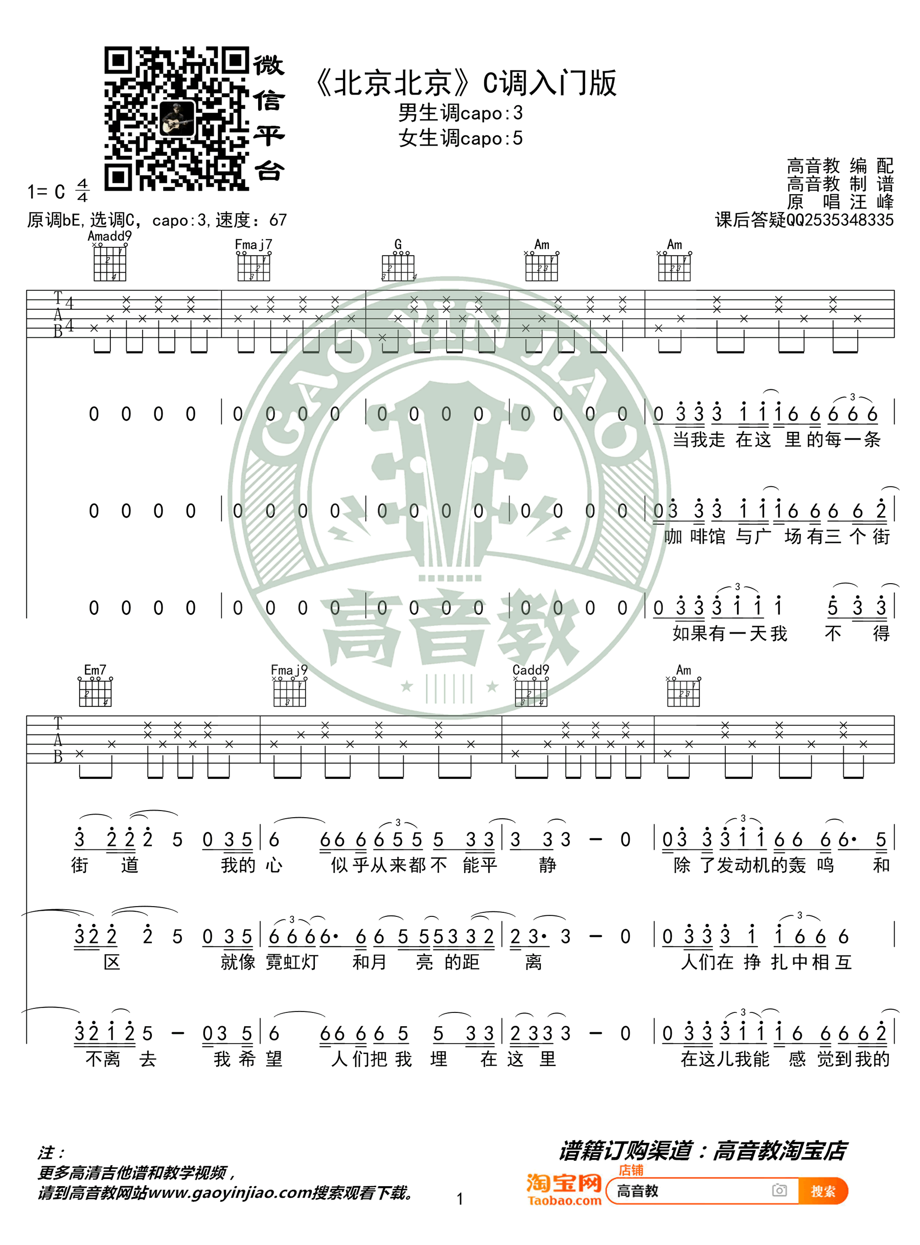- 北京北京吉他谱 汪峰 C调指法编配 高清弹唱谱