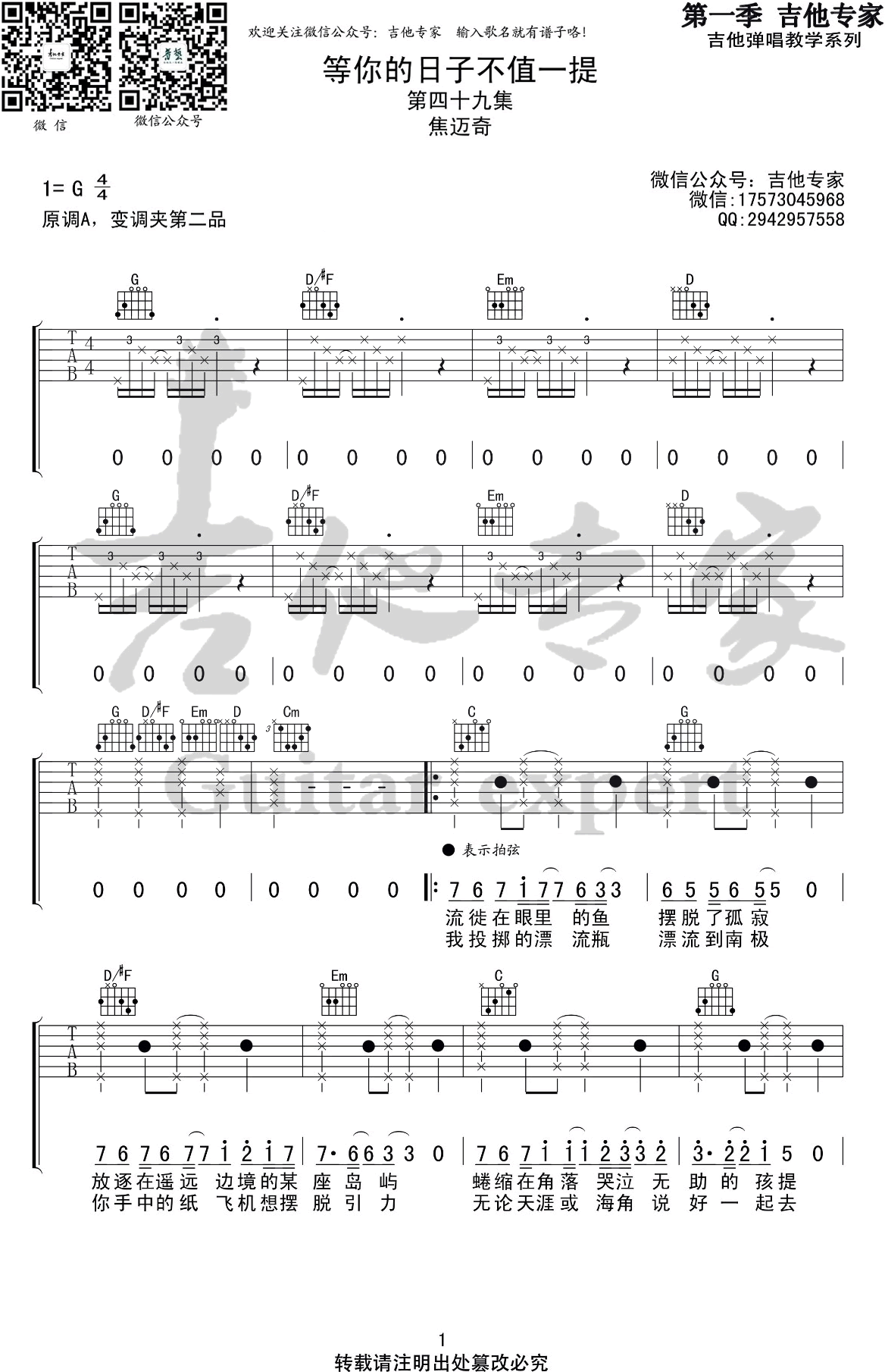 - 等你的日子不值一提吉他谱_焦迈奇《带着爸爸去留学》插曲