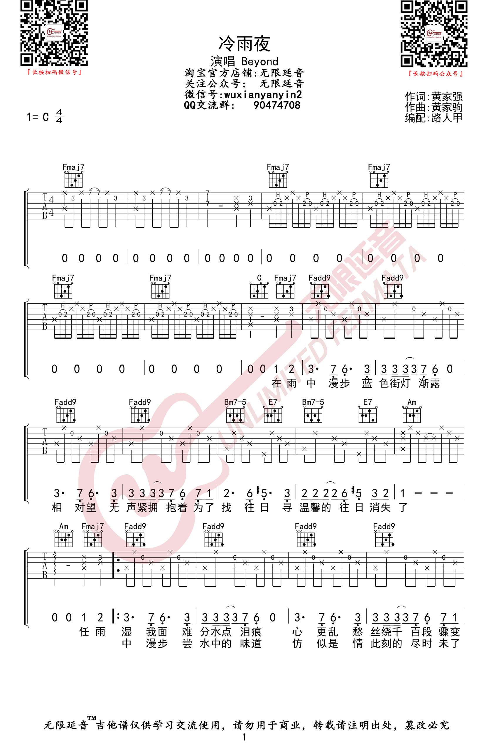 《冷雨夜》吉他谱,Beyond的一首代表歌曲,冷雨夜六线谱,C调指法,三张高清图片谱,无限延音编配制谱,易唱网更新上传。
