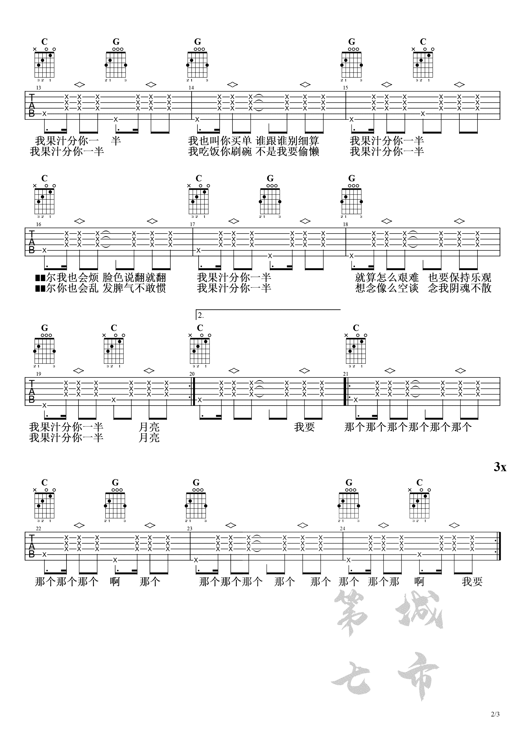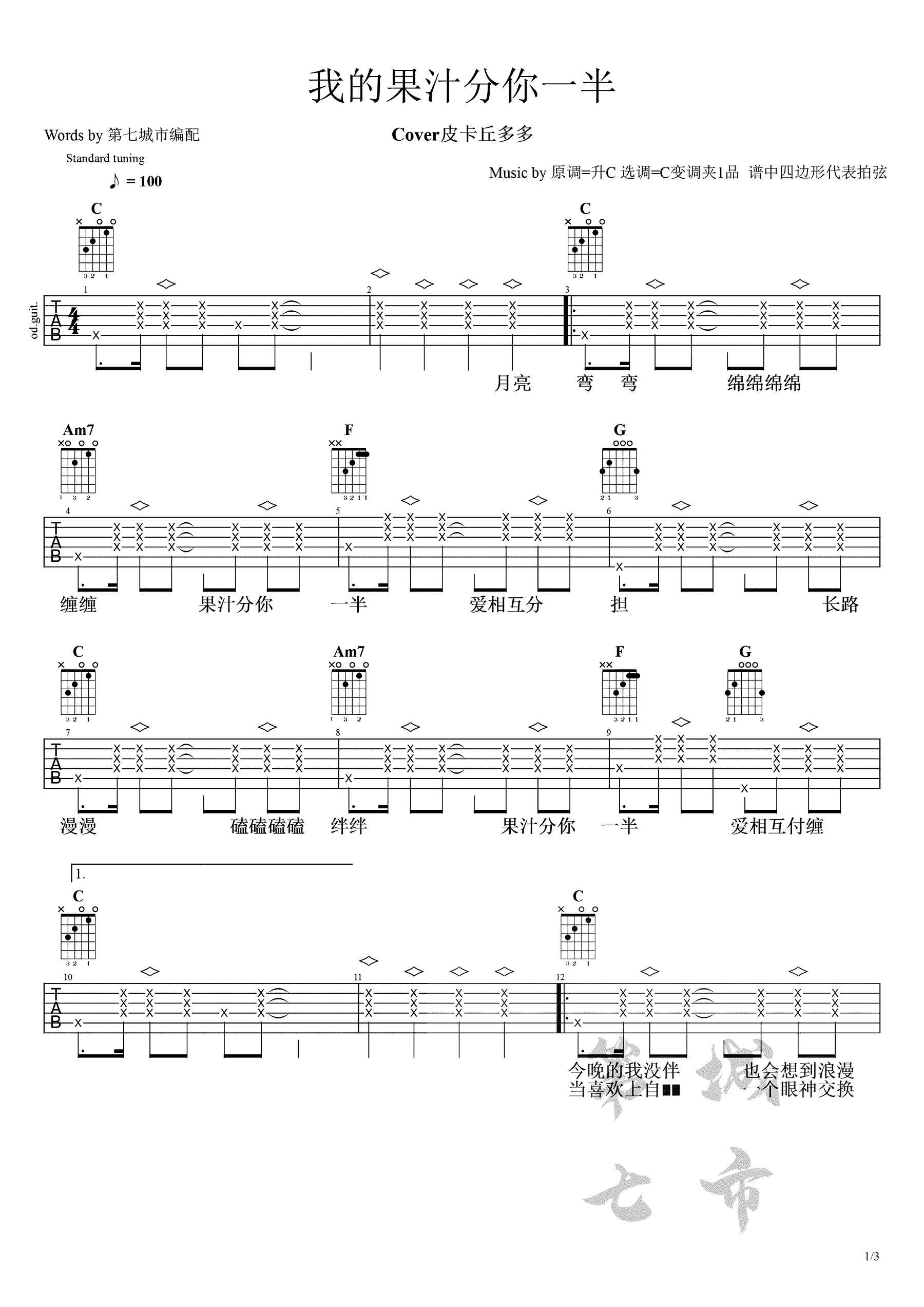 《我的果汁分你一半》吉他谱,皮卡丘多多演唱,花儿乐队的一首老歌,我的果汁分你一半六线谱,C调指法,变调夹夹一品,谱中四边形标注代表拍弦。第七城市编配分享,易唱网更新。