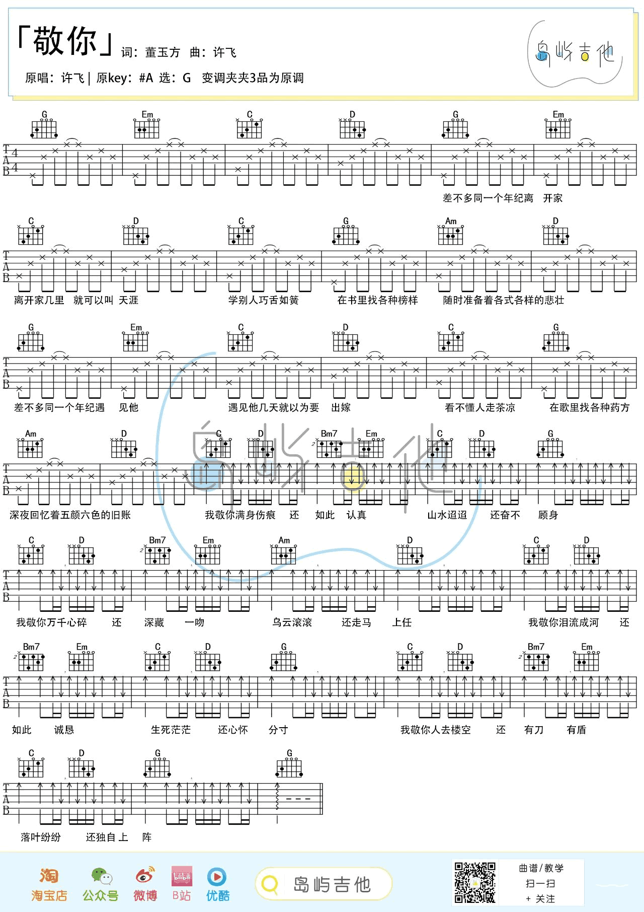 万茜敬你吉他谱 易唱网敬你吉他谱,许飞原创的一首歌曲,万茜在《乘风破浪的姐姐》节目吉他弹唱。敬你六线谱+和弦图片谱,原调升A,选用G调指法,变调夹夹三品为原调。感谢岛屿吉他编配出品,易唱网吉他谱上传收藏。