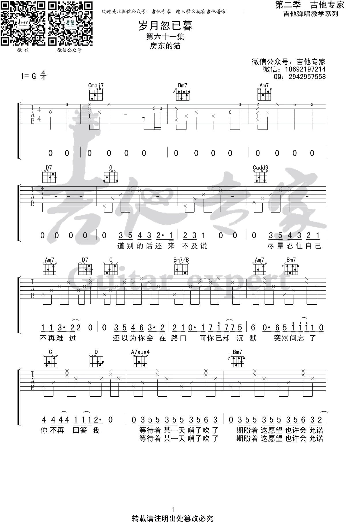 - 岁月忽已暮吉他谱_房东的猫_G调_弹唱六线谱