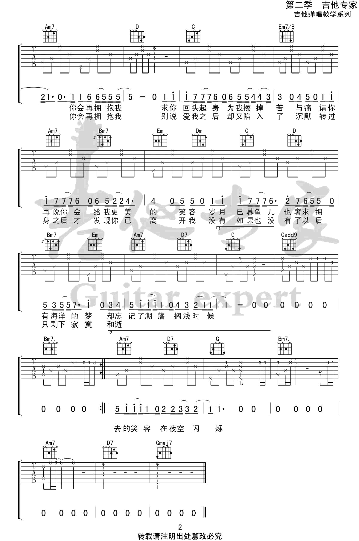 - 另一个天堂吉他谱_房东的猫_G调_弹唱六线谱
