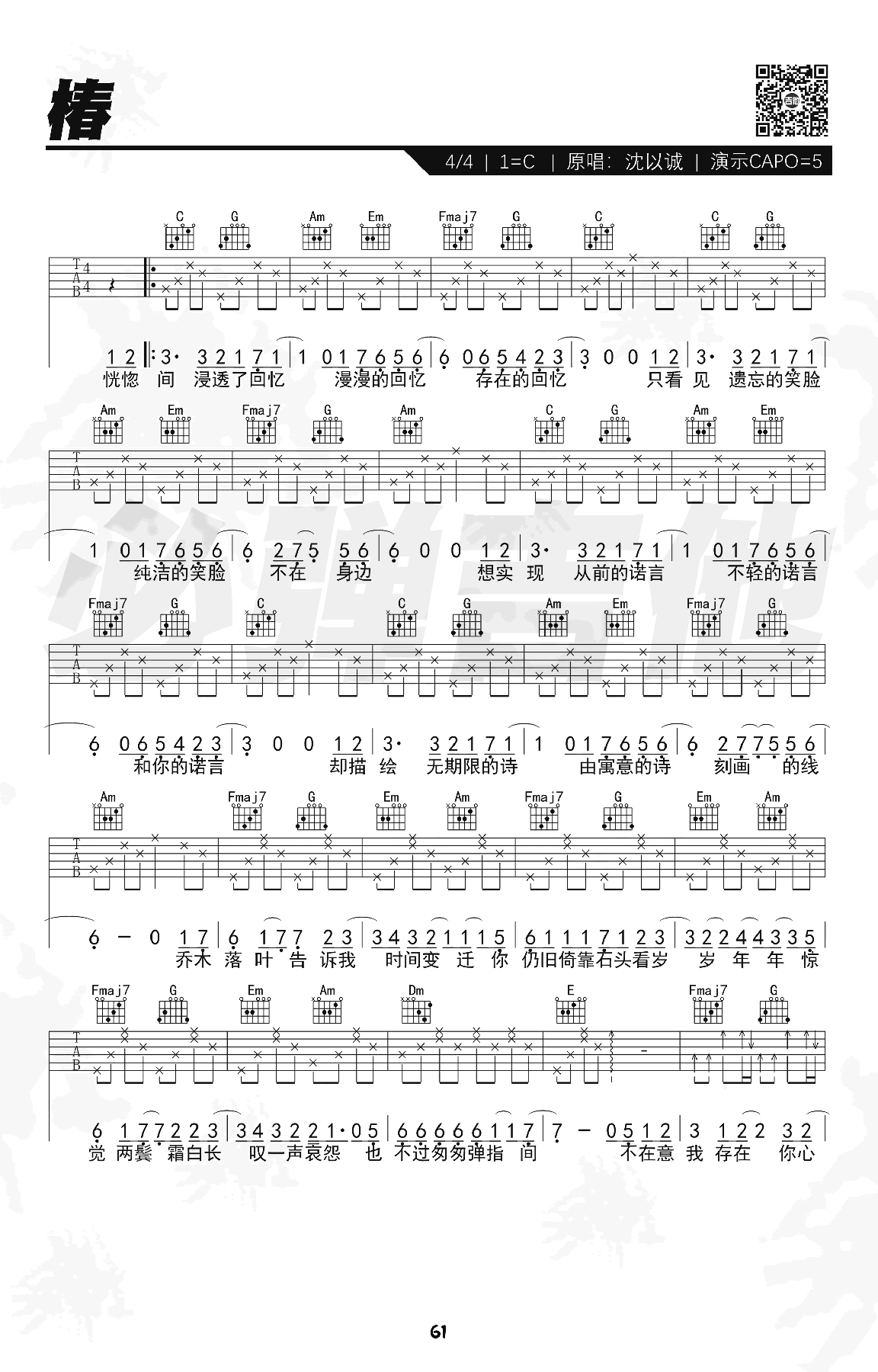 - 沈以诚《椿》吉他谱_C调指法_弹唱六线谱