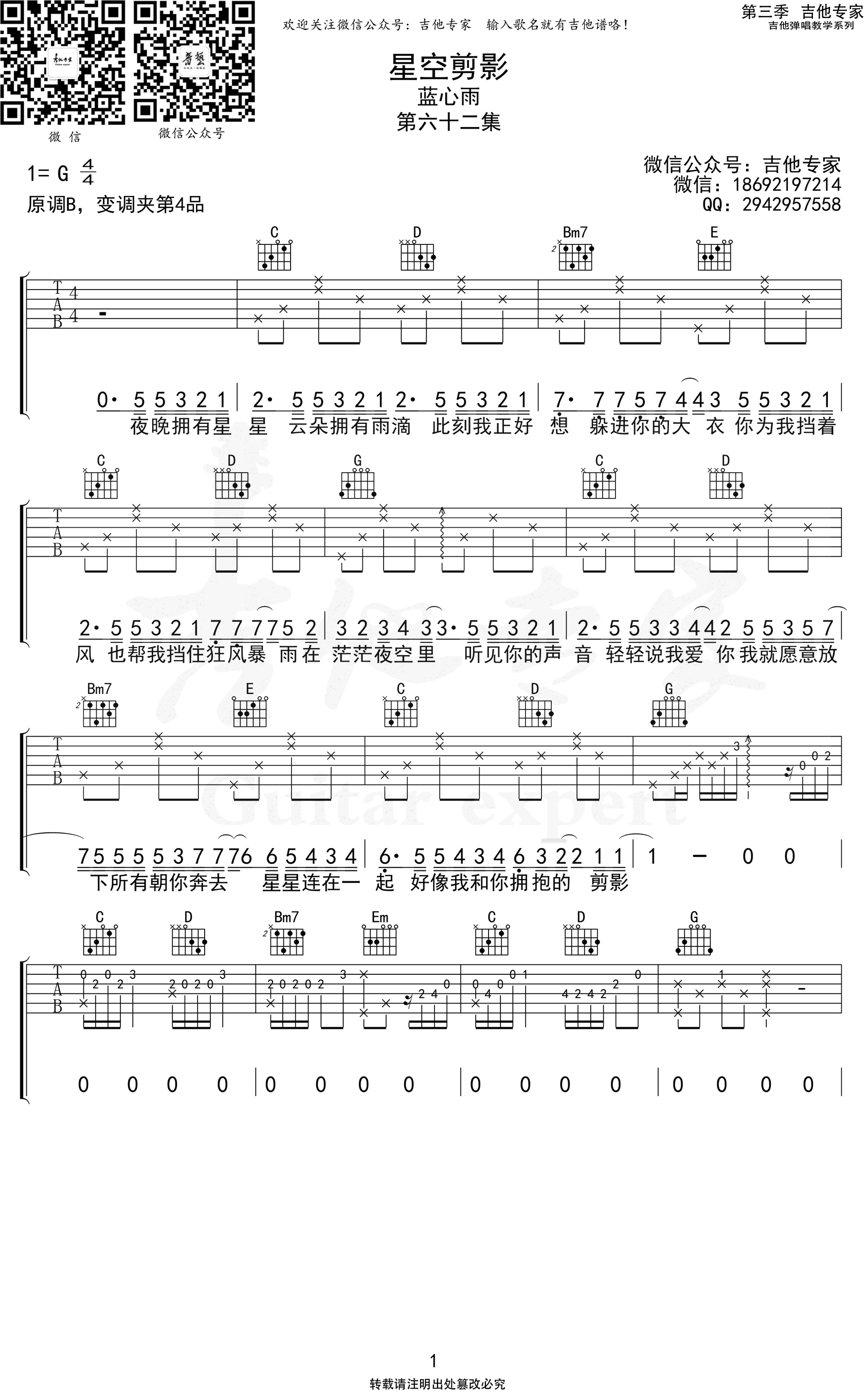- 星空剪影吉他谱_蓝心羽_G调弹唱谱_高清六线谱