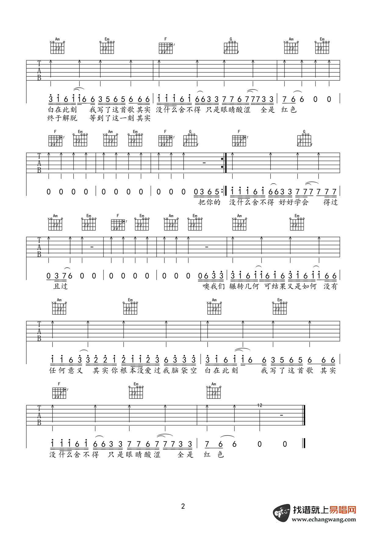 - 爱人错过吉他谱_告五人_C调原版_弹唱六线谱