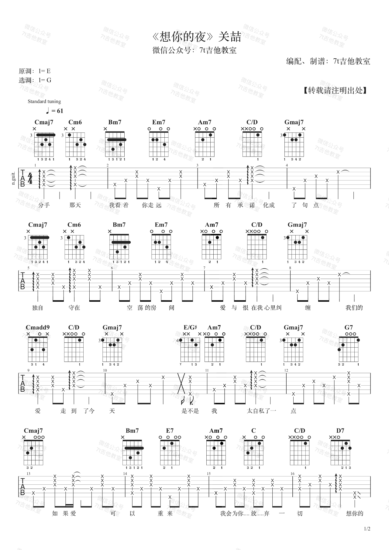 - 想你的夜吉他谱_关喆_G调弹唱谱_和弦分析+演示视频