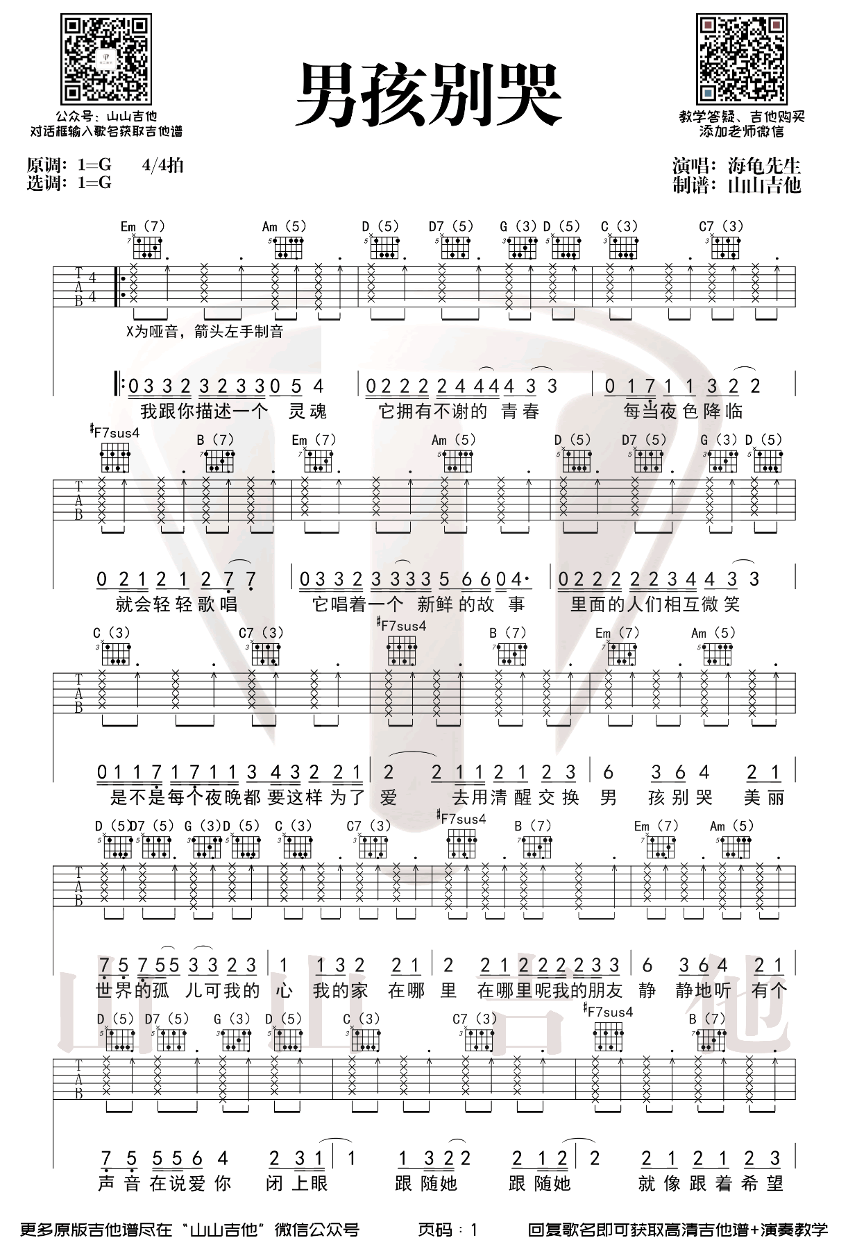 - 男孩别哭吉他谱_海龟先生_G调弹唱谱_完整六线谱