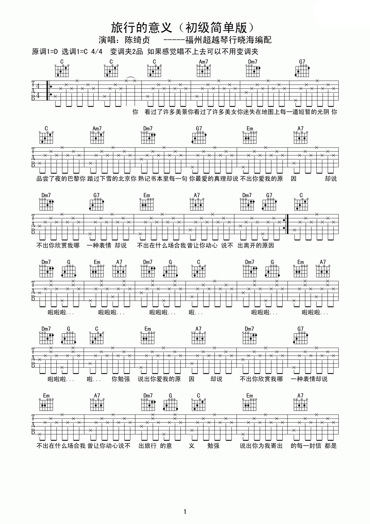 - 旅行的意义吉他谱 D调弹唱谱 陈绮贞