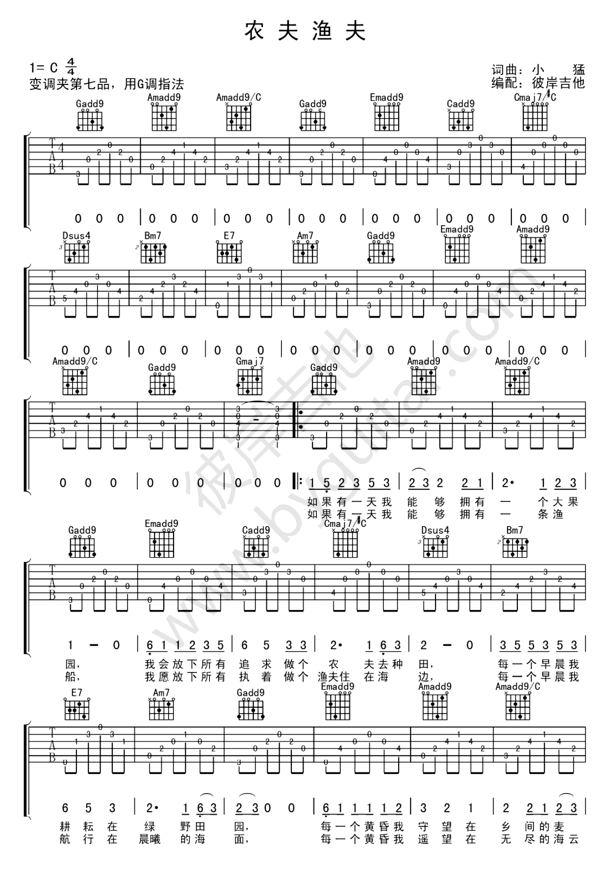 大乔小乔 农夫渔夫歌词 作曲 : 小猛 作词 : 小猛 如果有一天我能够拥有一个大果园 我愿放下所有追求做个农夫去种田 每一个早晨我耕耘在绿野田园 每一个黄昏我守望在乡间的麦田 我会把忧虑都融化在夕阳里 让孤独的心等待秋收的欢喜 哦如果那个时候我身边没有女朋友 我不介意谁会来给我一个周末的问候 哦如果那个时候我依然牵着她的手 我们会幸福的坐上树枝头 如果有一天我能够拥有一条渔船 我愿放下所有执着做个渔夫住在海边 每一个早晨我航行在晨曦的海面 每一个黄昏我遥望在无尽的海云间 我会把思绪都消失在波涛里 让澎湃的心等待风雨后的平息 哦如果那个时候我身边没有女朋友 我不介意谁会来给我一个周末的问候 哦如果那个时候我依然牵着她的手 我们会幸福的坐上弯弯船头 哦如果那个时候我身边没有女朋友 我不介意谁会来给我一个周末的问候 哦如果那个时候我依然牵着她的手 我们会幸福的坐上弯弯船头 我们会停泊在爱人的码头