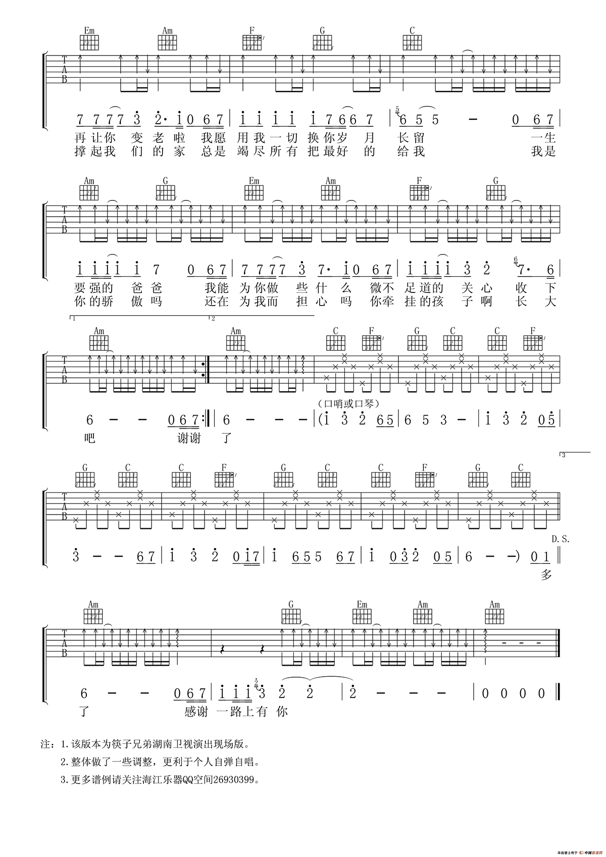 筷子兄弟父亲吉他谱父亲吉他谱,筷子兄弟的一首感人肺腑的歌曲,原调E,变调夹夹4品,选用C调指法。父亲吉他弹唱谱,高清图片六线谱,根据筷子兄弟湖南卫视现场演唱版本改编,感谢卢海江的编配和分享,易唱整理上传。曲谱整体略作调整,方便琴友吉他弹唱。