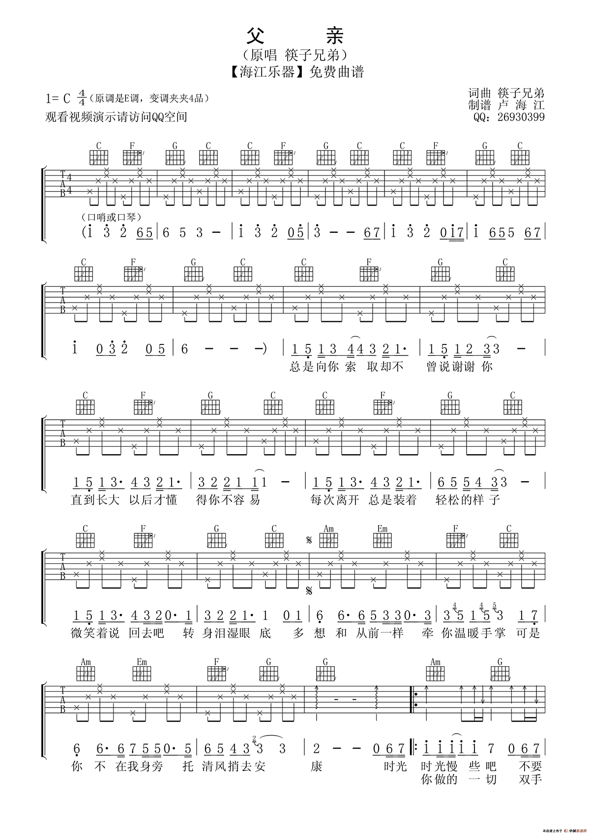 父亲吉他谱 筷子兄弟 C调弹唱版 高清图片谱