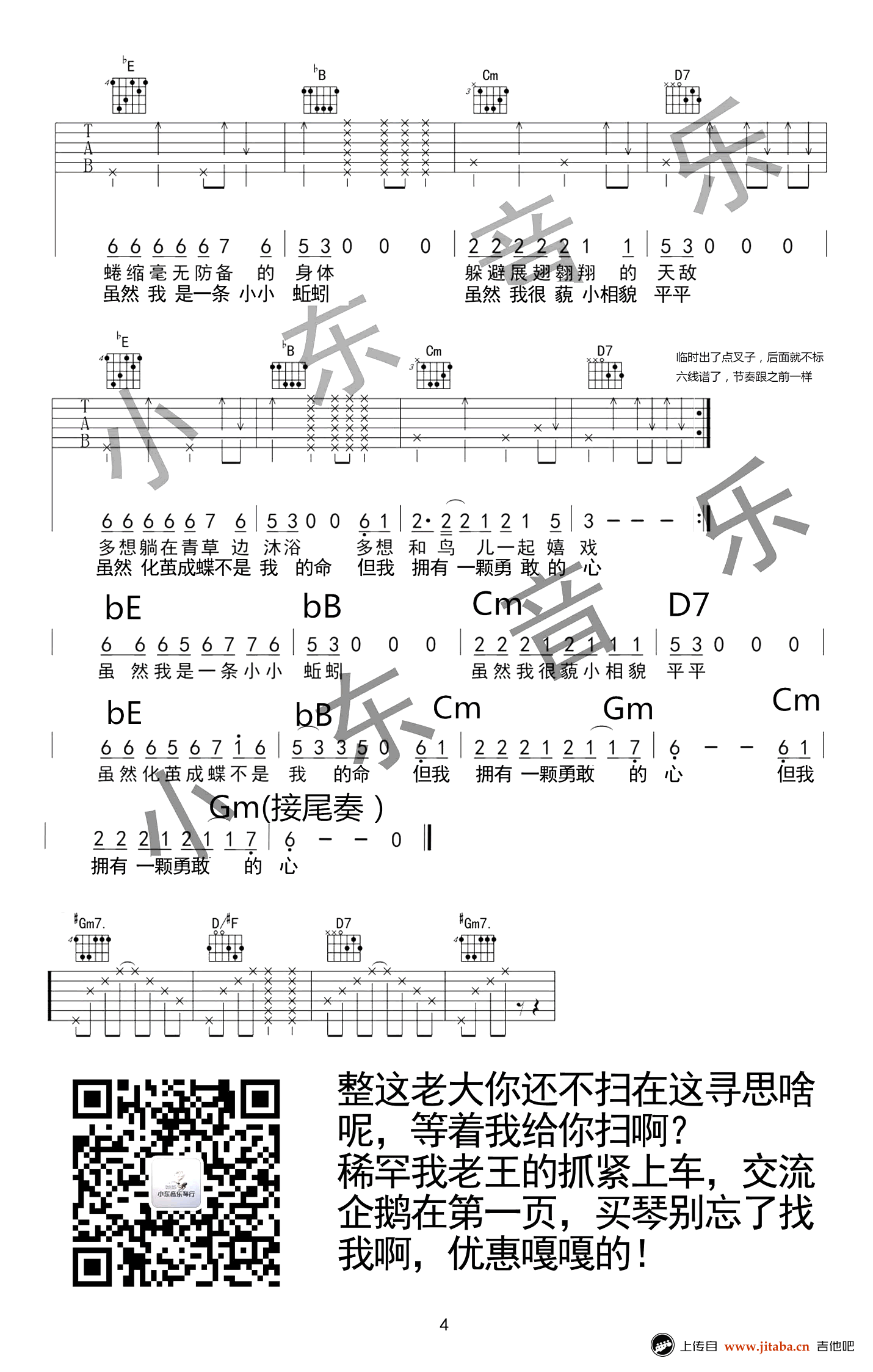 蚯蚓六线谱,《欢乐颂2》电视剧插曲,邱莹莹的主题歌,蚯蚓吉他谱,当前页面显示的是曲谱的后两张图片谱例。