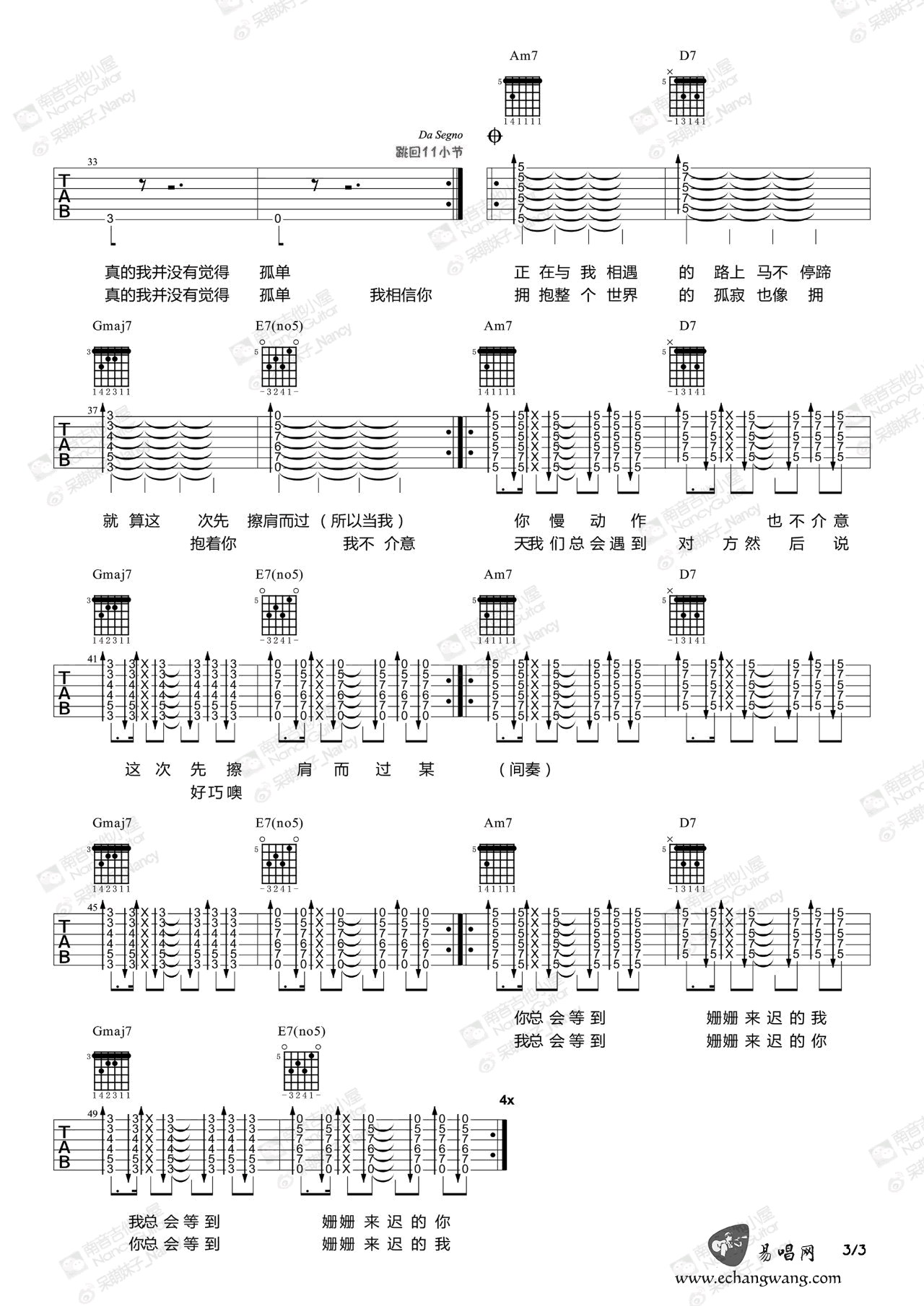 致姗姗来迟的你 歌词 作曲 : 阿肆 作词 : 阿肆 编曲 : 吴涛 录音师 : 陈文骏/陈程 吉他 : 陈涛 小号 : 张君声 贝司 : 张君声 鼓 : 盛雄轩 合声 : 阿肆/林宥嘉/陈晓磊 我不介意你慢动作 也不介意这次先擦肩而过 吃一人份的饭 刷一人份的碗 真的我并没有觉得孤单 逛一人份的街 买一人份的单 真的我并没有觉得孤单 我相信你正在与我相遇的路上马不停蹄 所以当我拥抱整个世界的孤寂 也像拥抱着你 我不介意你慢动作 也不介意这次先擦肩而过 某天我们总会遇到对方然后说 原来 是你噢 我不介意你慢动作 也不介意这次先擦肩而过 某天你会发现灯火阑珊处的我 等了你 好久噢 吃一人份的饭 刷一人份的碗 真的我并没有觉得孤单 逛一人份的街 买一人份的单 真的我并没有觉得孤单 我相信你正在与我相遇的路上马不停蹄 所以当我拥抱整个世界的孤寂 也像拥抱着你 我不介意你慢动作 也不介意这次先擦肩而过 某天我们总会遇到对方然后说 原来 是你噢 我不介意你慢动作 也不介意这次先擦肩而过 某天你会发现灯火阑珊处的我 等了你 好久噢 正在与我相遇的路上马不停蹄 就算这次先擦肩而过 所以当我拥抱整个世界的孤寂 也像拥抱着你 我不介意你慢动作 也不介意这次先擦肩而过 某天我们总会遇到对方然后说 好巧噢 你总会等到姗姗来迟的我 我总会等到姗姗来迟的你
