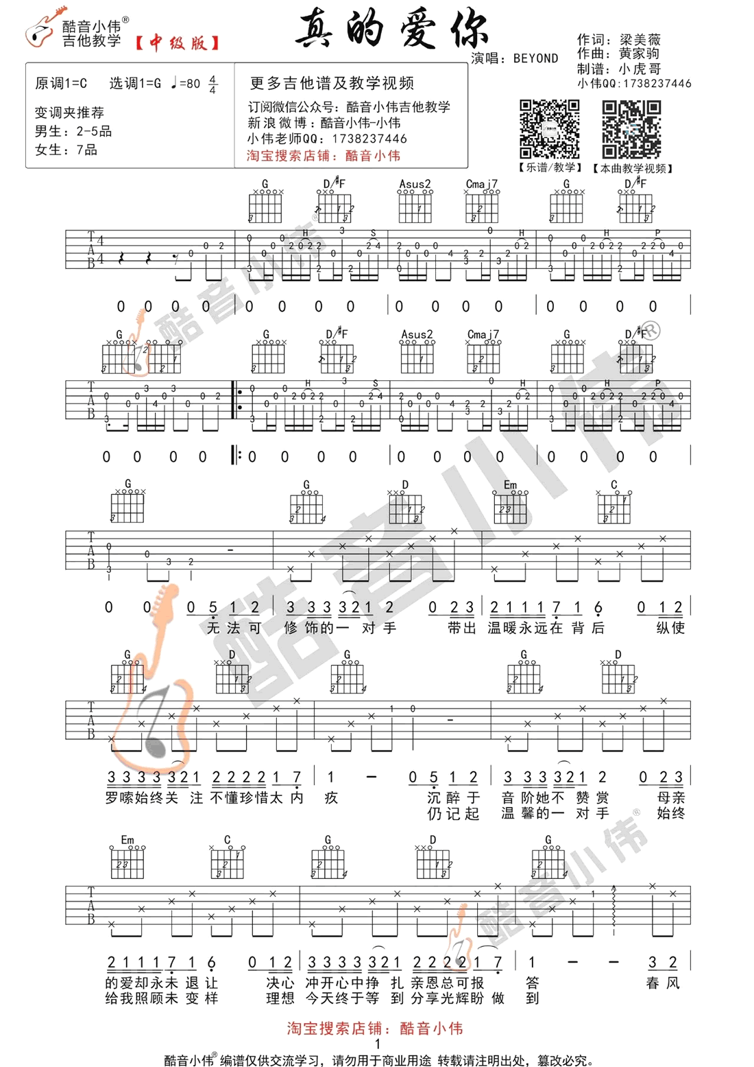 真的爱你吉他谱,Beyond演唱,一首经典粤语歌曲,《真的爱你》六线谱,高清图片谱,原调C,选用G调指法编配,男生变调夹推荐2到5品,女生变调夹推荐7品,感谢酷音小伟提供曲谱和配套教学视频,易唱网推荐分享。