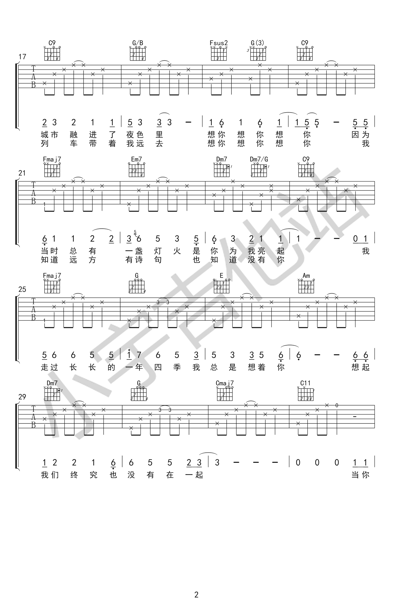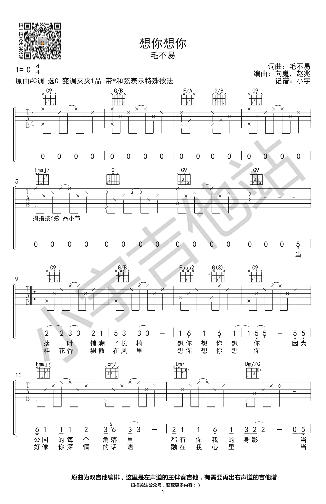 想你想你吉他谱,毛不易作词作曲并演唱的一首歌曲。《想你想你》六线谱,三张高清图片谱,原曲升C调,选用C调,变调夹夹1品,带*和弦表示特殊按法。感谢小宇吉他站的编配,易唱网推荐分享。