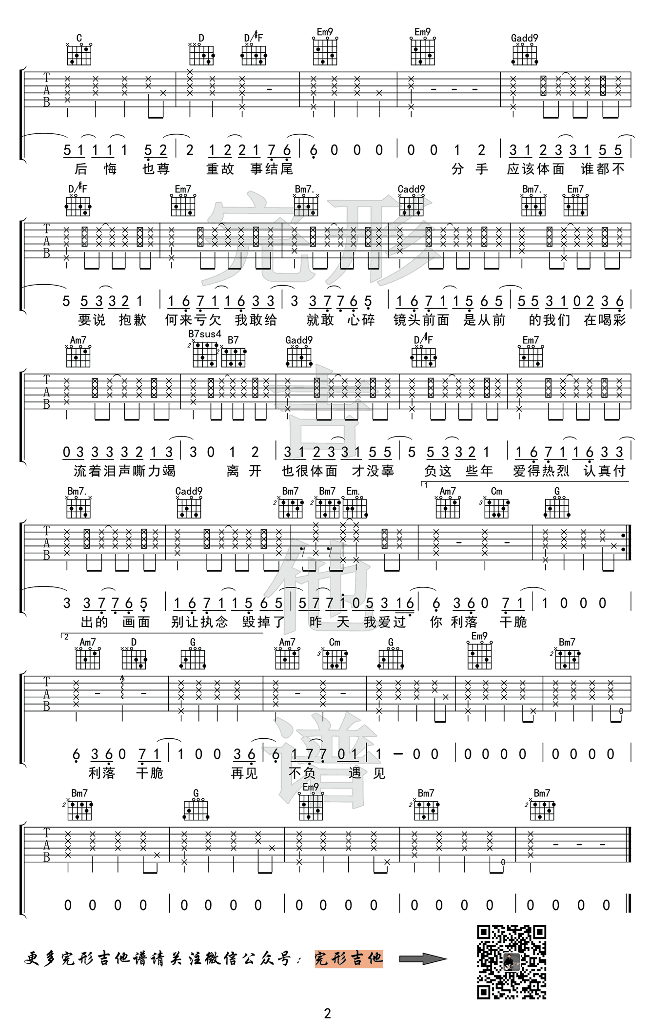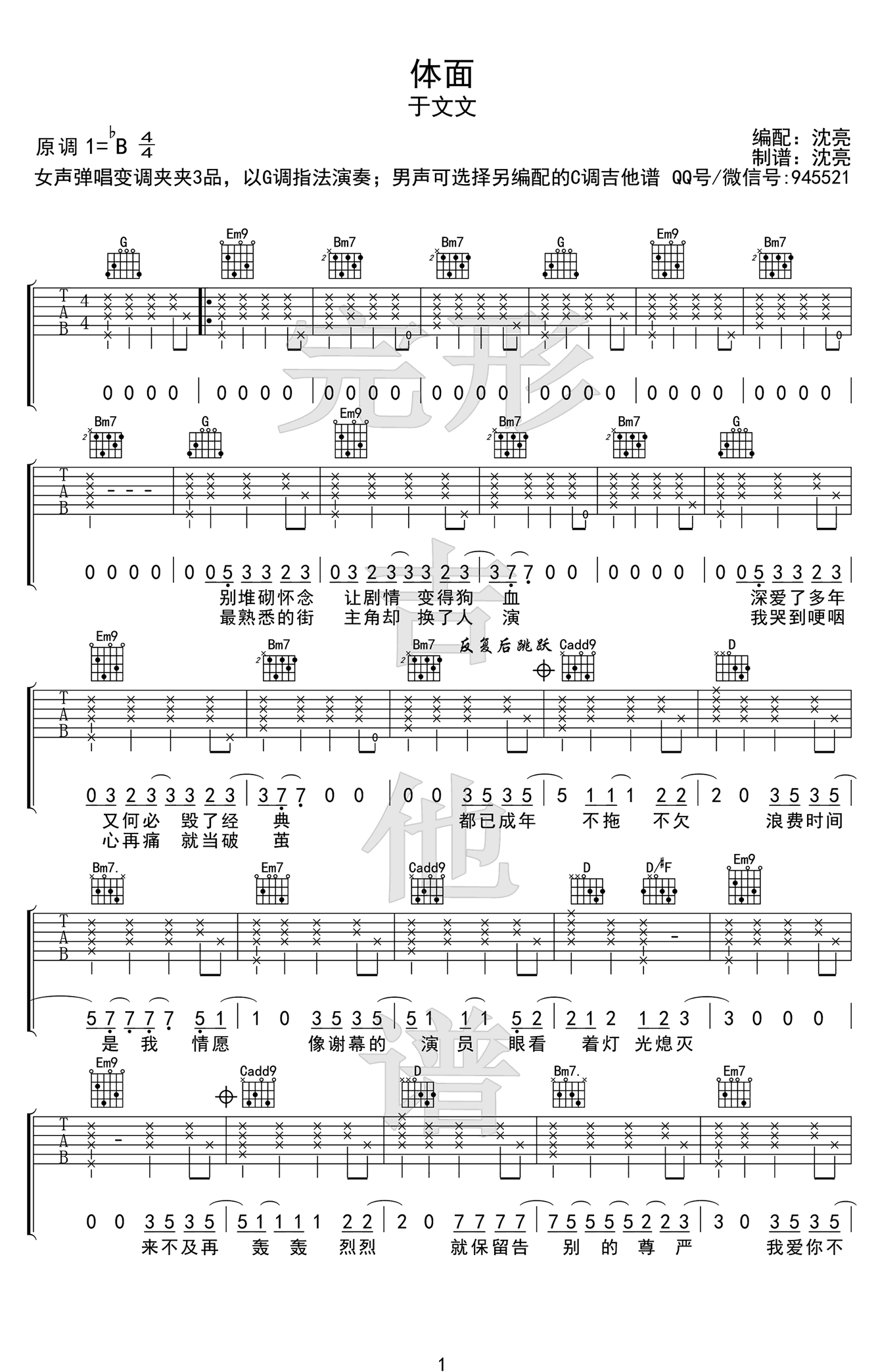 - 于文文《体面》吉他谱 G调六线谱 电影《前任3》插曲