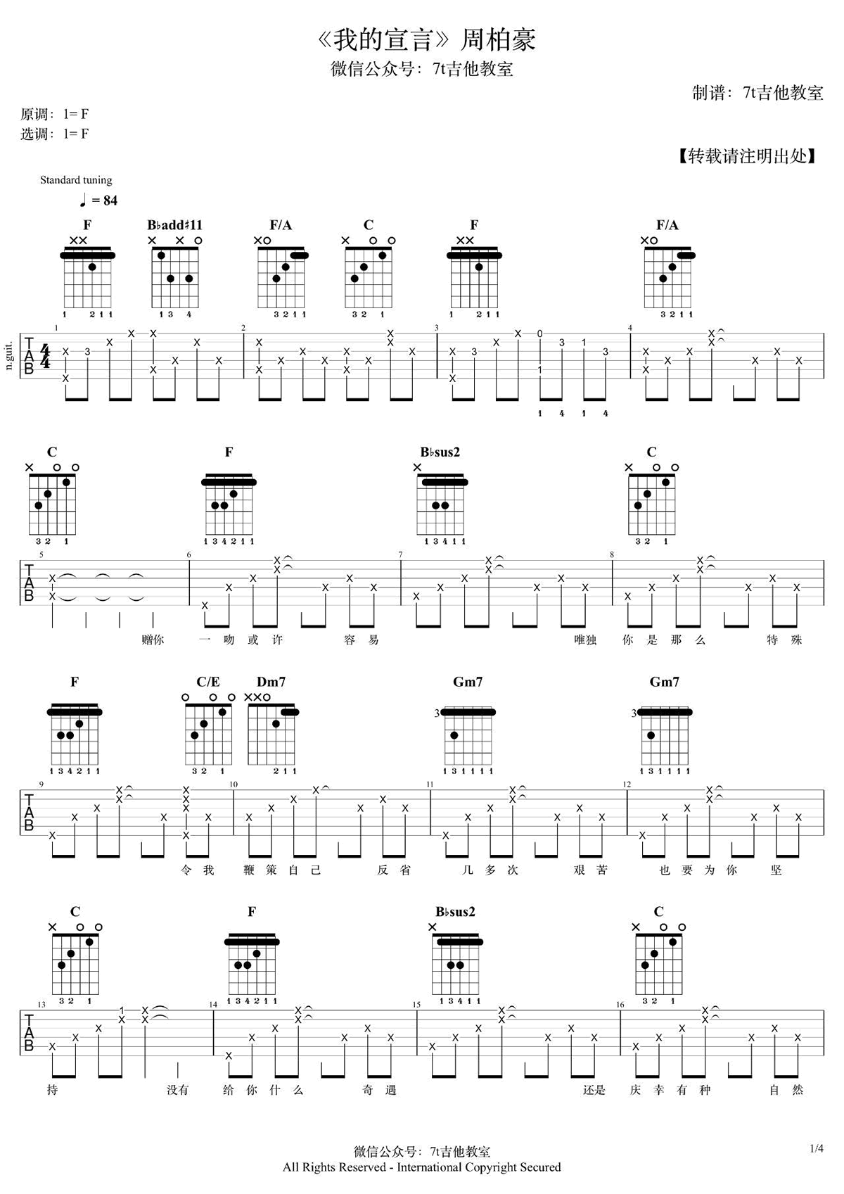 我的宣言吉他谱,周柏豪演唱的一首粤语歌曲,《我的宣言》吉他弹唱谱,四张高清图片谱,歌曲选用原调F调,7T吉他编配并提供吉他弹唱演示,易唱网推荐分享。