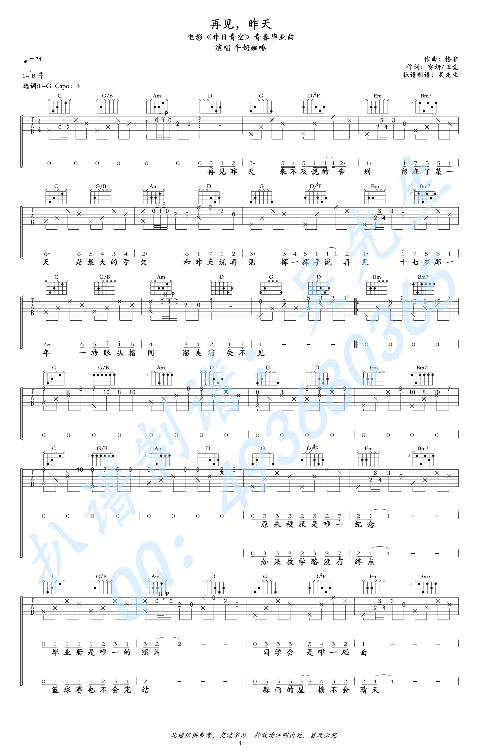 - 于文文《体面》吉他谱 G调六线谱 电影《前任3》插曲