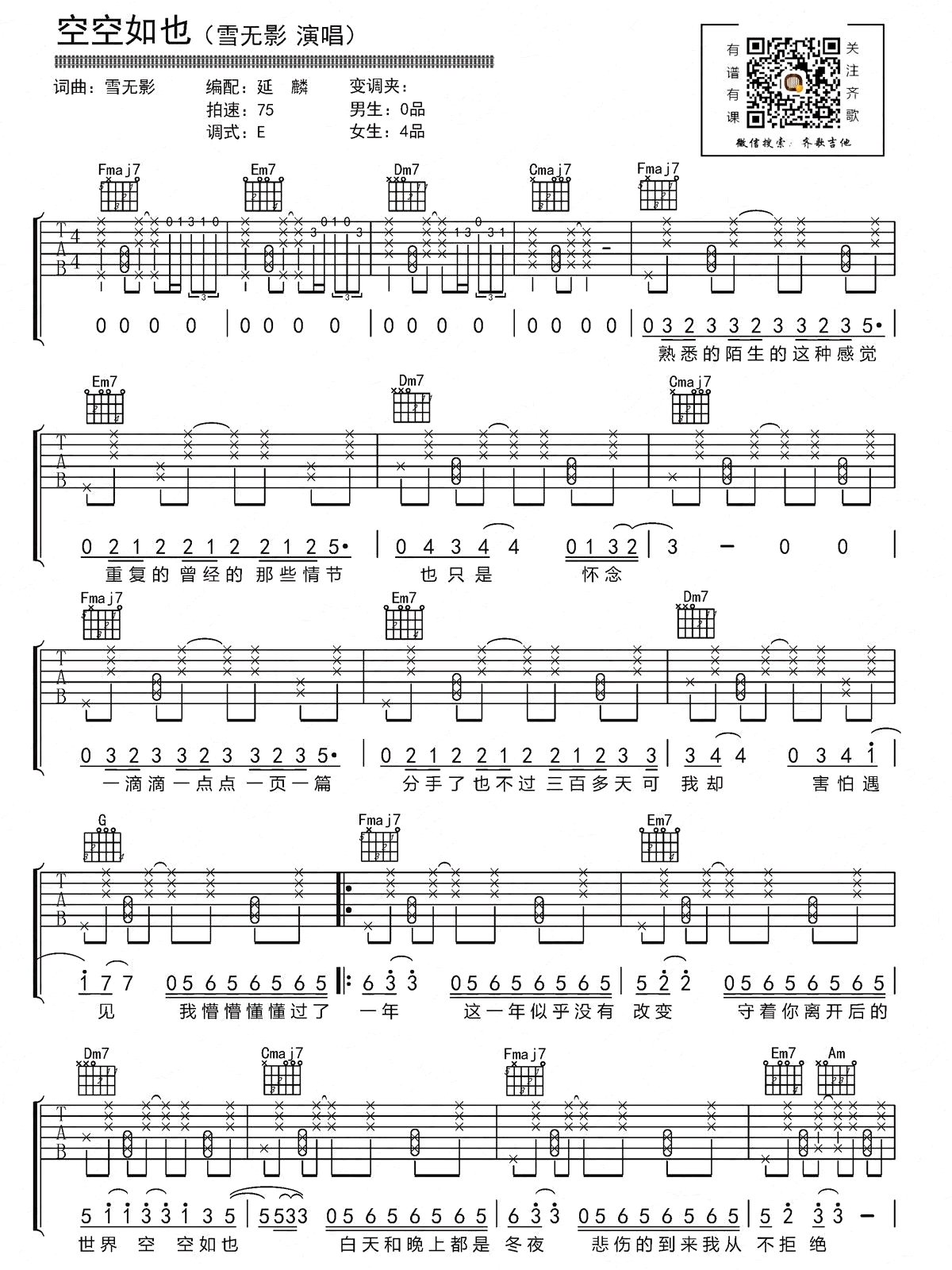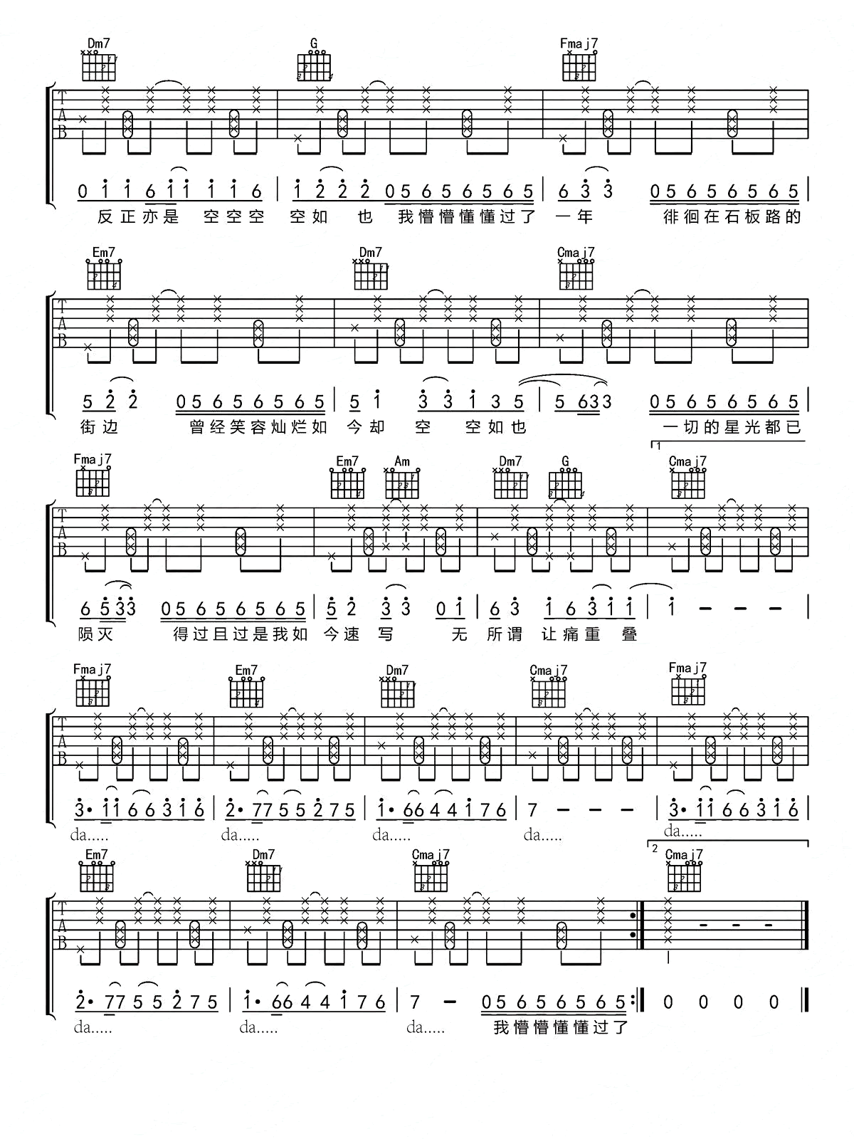 - 空空如也吉他谱_胡66_E调指法_拍弦弹唱谱