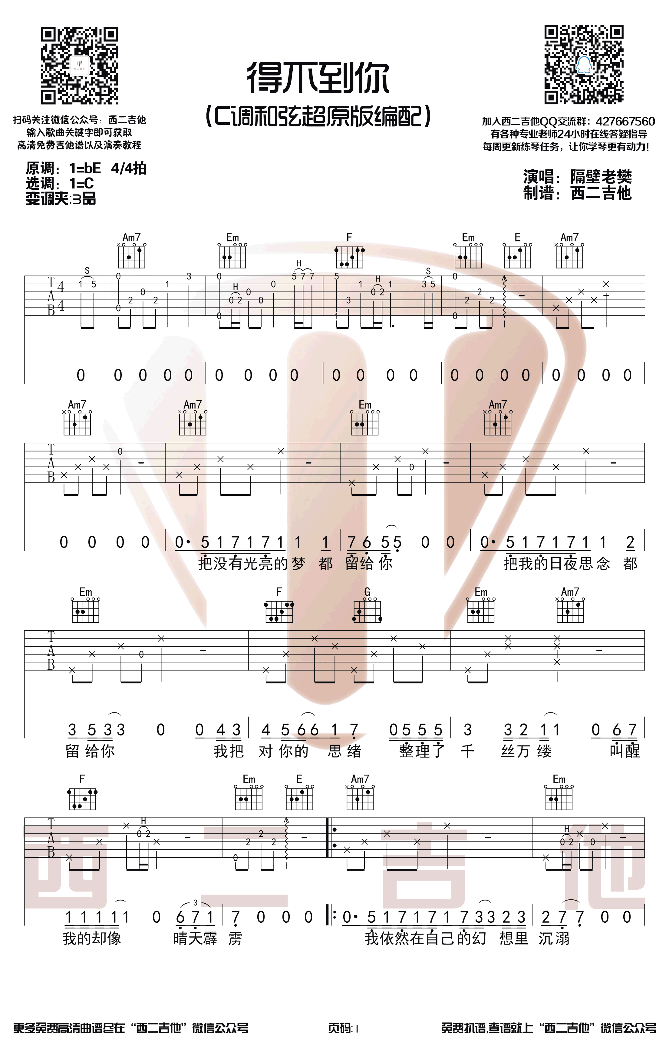 - 隔壁老樊《得不到你》吉他谱_C调超原版_图片谱