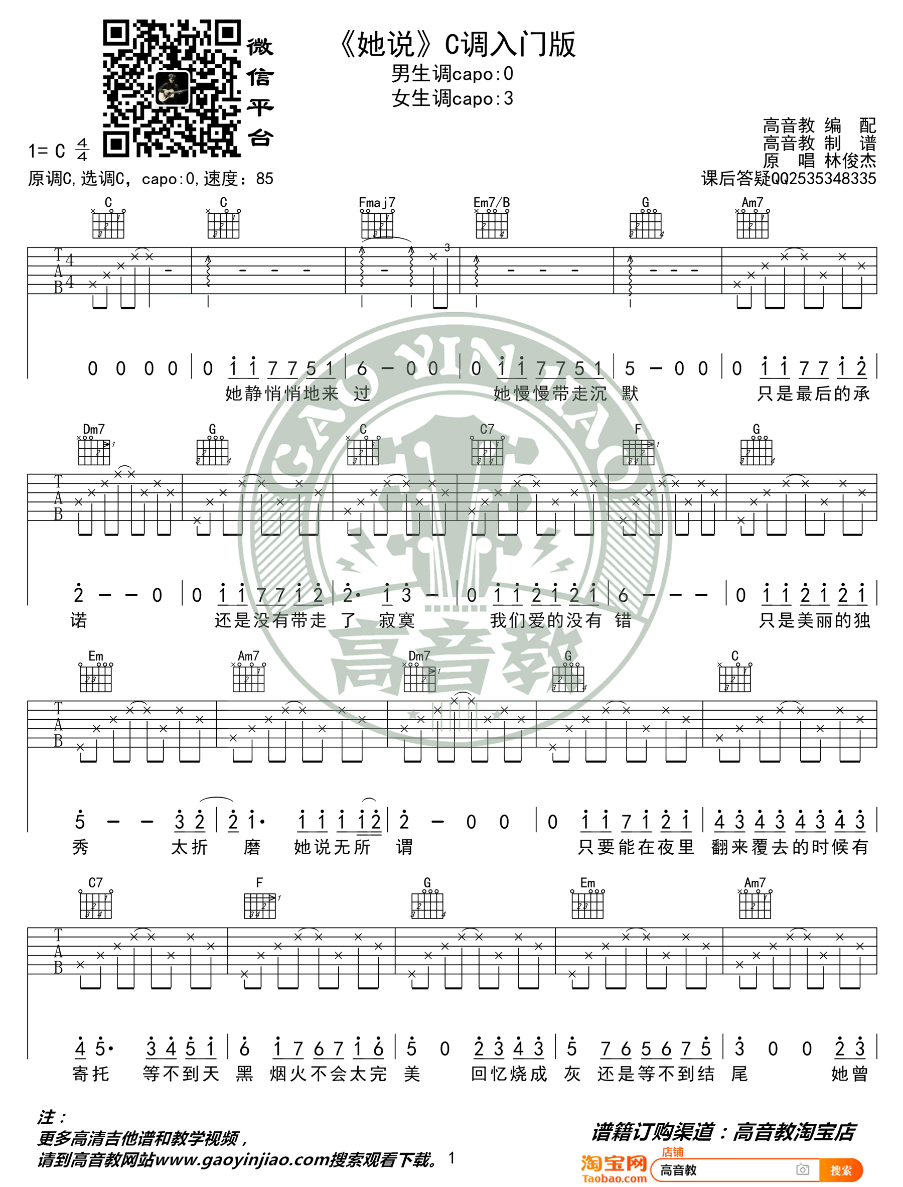 - 林俊杰《她说》吉他谱_C调简单版_入门弹唱谱