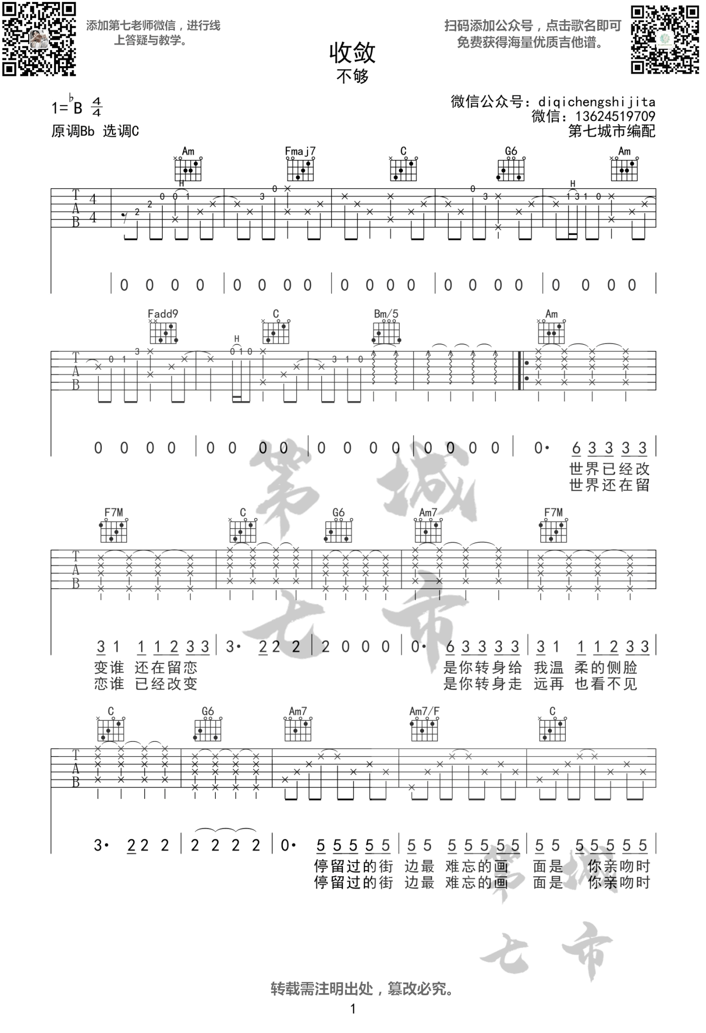 - 不够《收敛》吉他谱_C调指法_弹唱图片谱