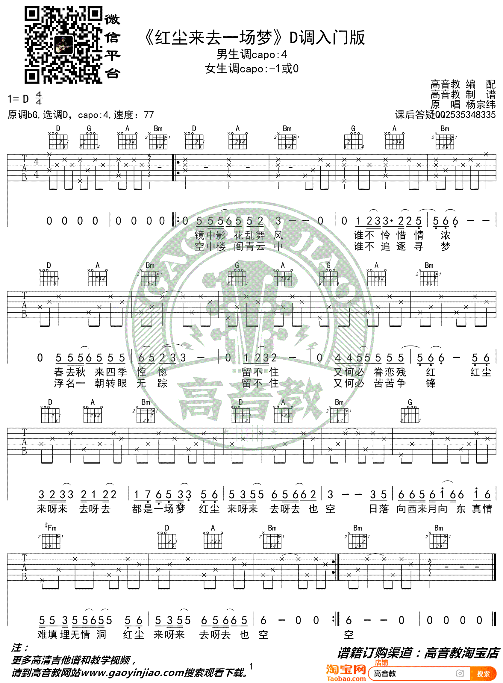 - 红尘来去一场梦吉他谱_杨宗纬_D调入门版_弹唱教学视频