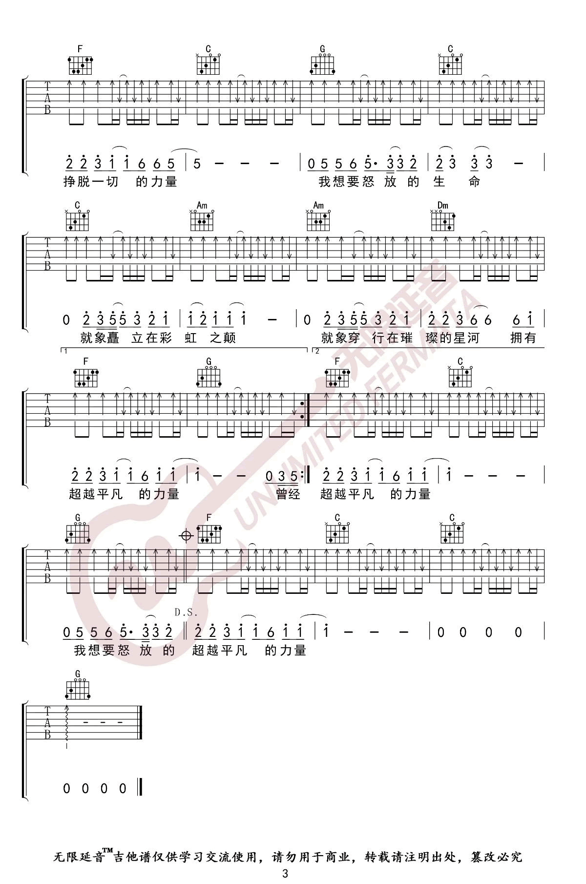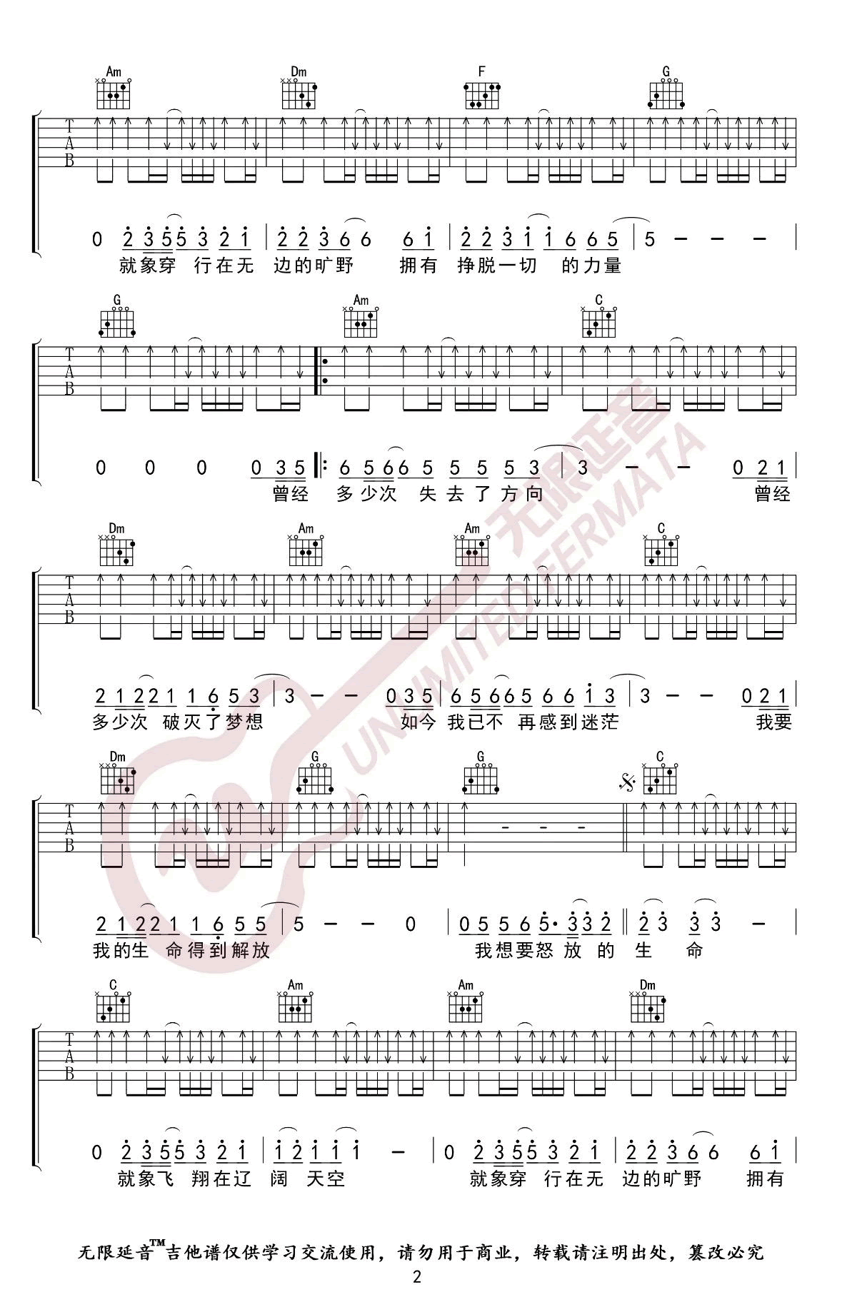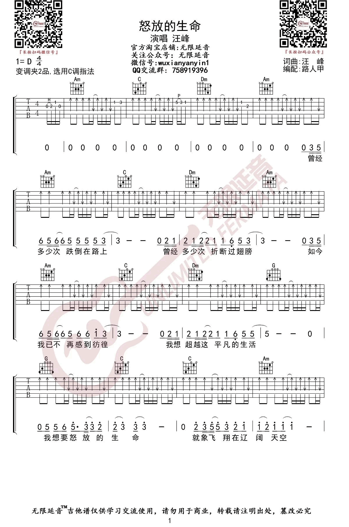 - 怒放的生命吉他谱_汪峰_C调指法_弹唱六线谱