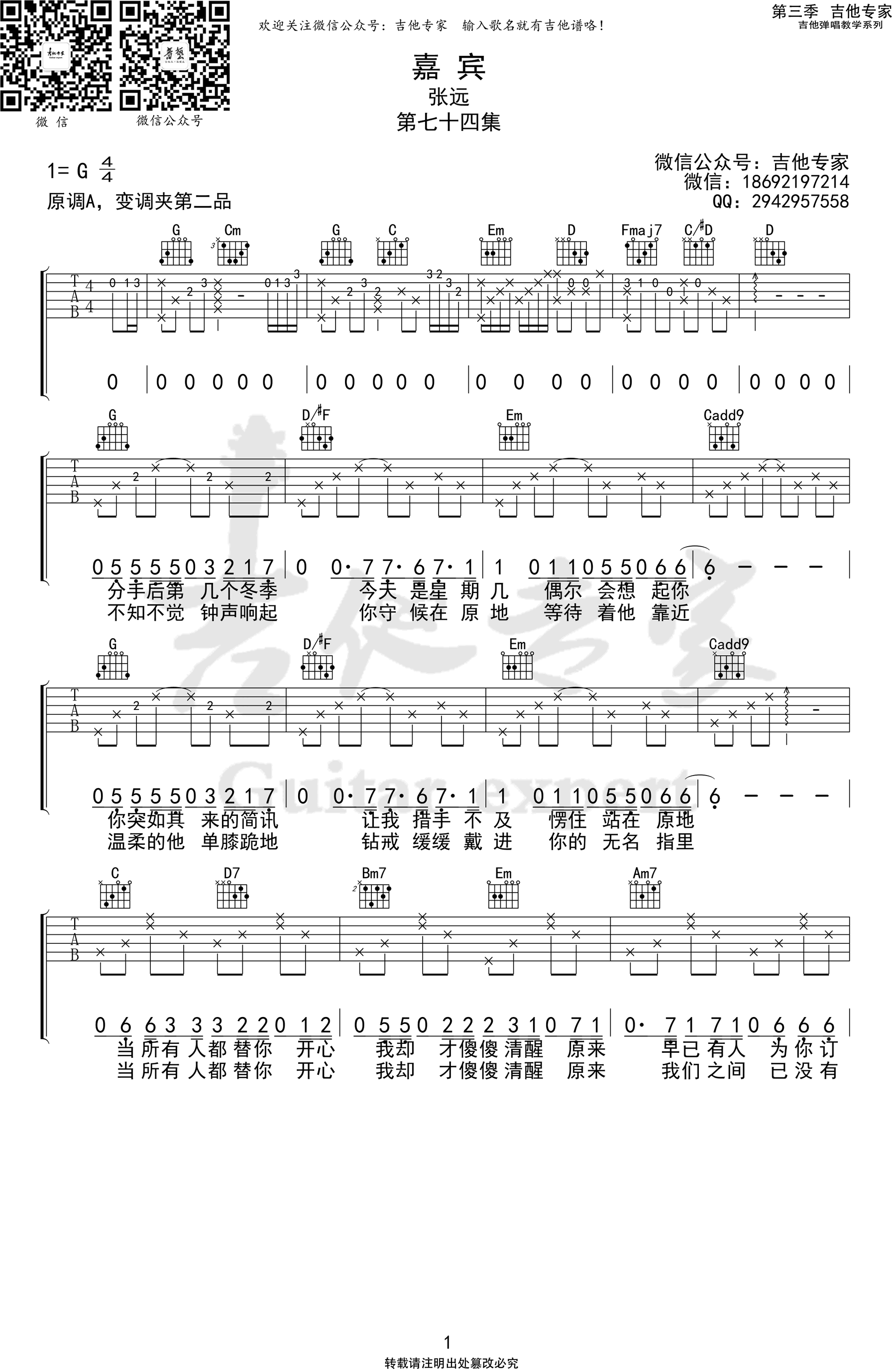 - 张远《嘉宾》吉他谱_G调原版弹唱谱_高清六线谱