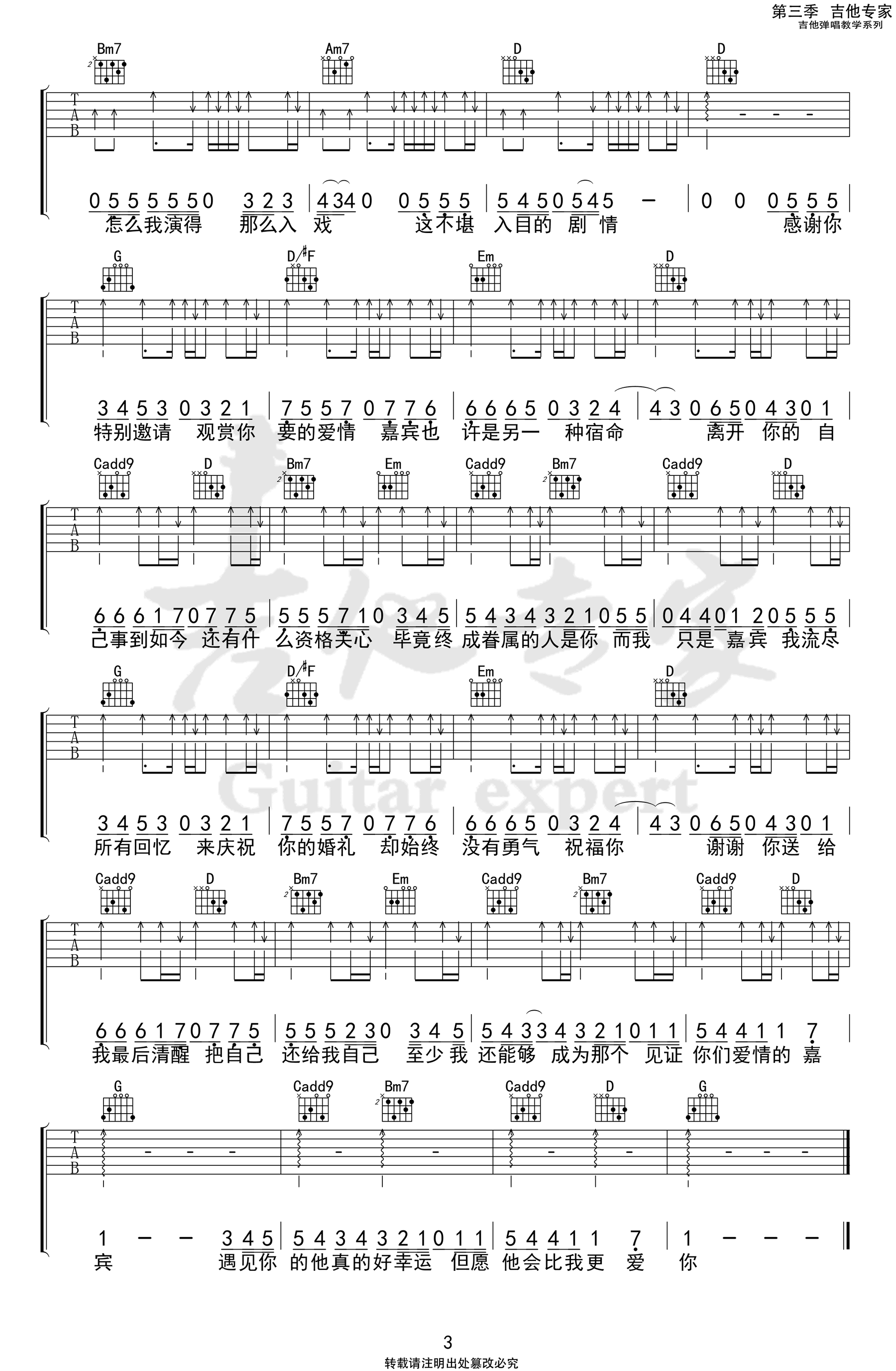 《嘉宾》吉他谱,张远的一首爆红网络的热门苦情歌曲,歌声温暖缱绻,将伤痛情感细腻倾诉。嘉宾六线谱,原调A选调G,变调夹夹二品,三张高清弹唱图片谱。感谢吉他专家制谱出品,易唱网整理上传。一首诠释爱情苦涩的伤感歌曲,“未得到”和“已失去”不是最珍贵的,而是最刻骨铭心的,可能人生中总要有这么几道刻痕,才算得上精彩而有印记的生命吧。